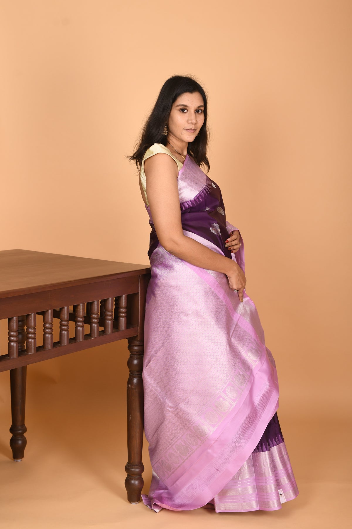 Eggplant Purple and Lilac Lavender Big Borde pure kanchi silk saree