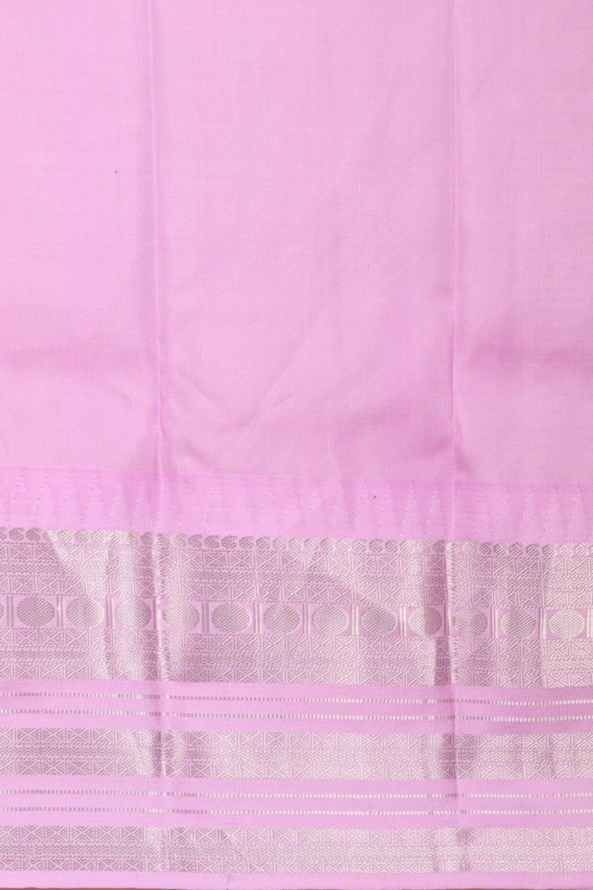 A rich Eggplant Purple body that offers a deep, lustrous backdrop, beautifully contrasted by a vibrant Lilac Lavender border and pallu. Designed with a signature Grand Lavender Border, adorned with intricate silver-toned zari work that adds a touch of modern royalty. The body is peppered with delicate, circular silver zari motifs (buttas), providing a balanced shimmer throughout the drape. Subtle Rekku (temple) patterns bridge the purple body and the lavender border, showcasing authentic Korvai weaving techniques. Blouse worn by the model is for styling only last image shown is the actual blouse .