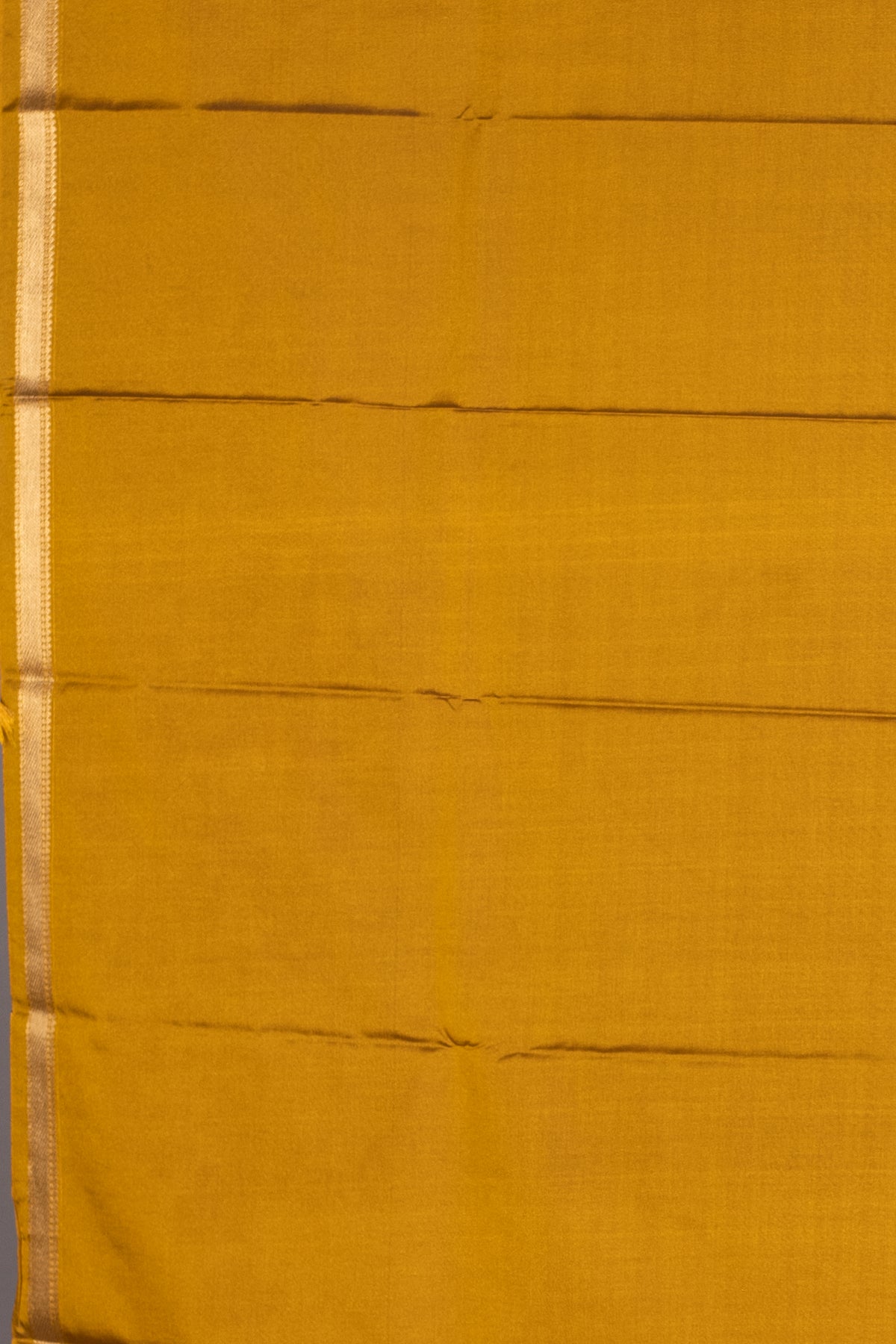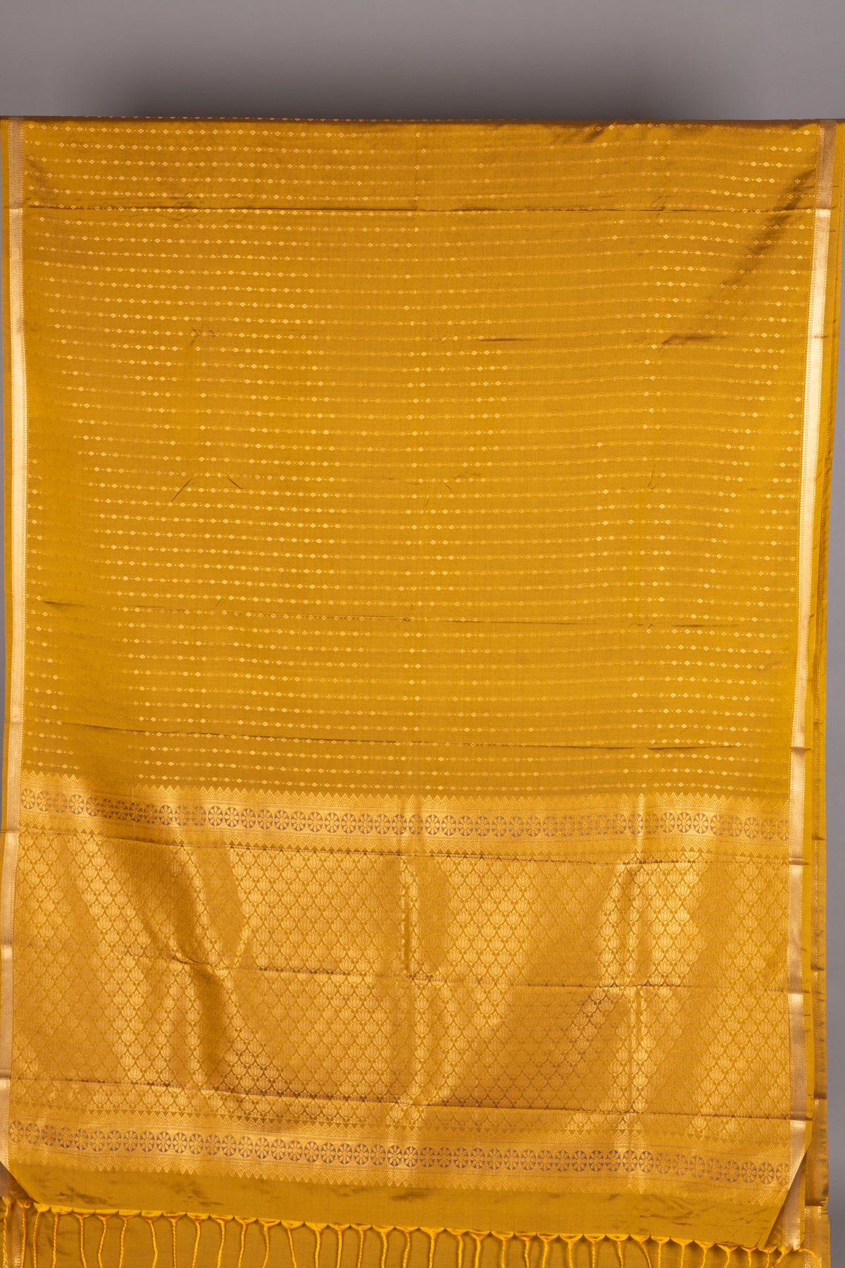 This elegant saree is a magnificent showcase of traditional color and texture. The deep Mustard hue, reminiscent of turmeric or deep gold, is entirely woven with shimmering gold zari, creating a sophisticated and vibrant drape perfect for traditional festivities.Likely a Pure Silk or premium Semi Silk blend, offering a rich luster and a fluid, elegant fall.The Mustard field is entirely patterned with delicate gold zari buttas. These motifs appear to be small, continuous vertical diamond or dotted patterns running throughout the body.