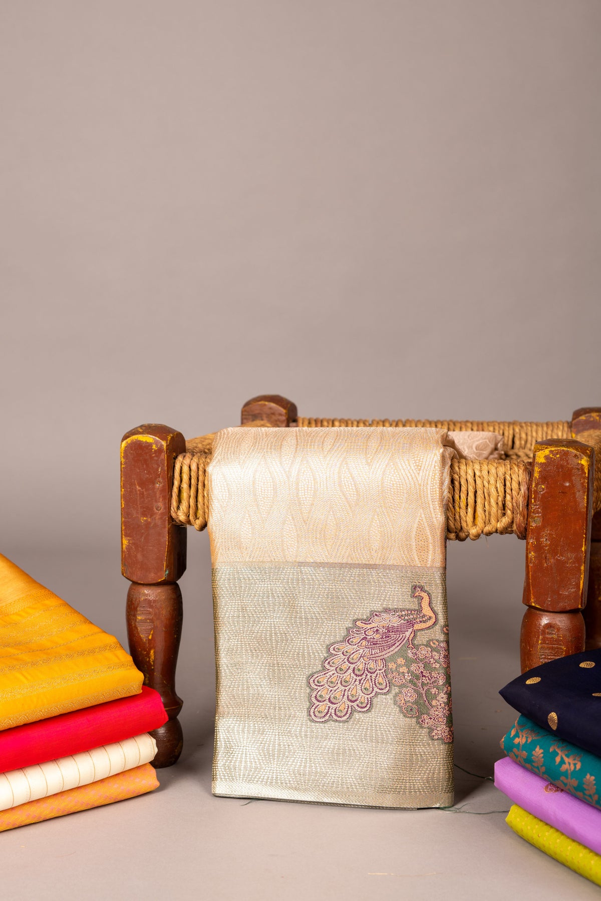 Unveil timeless charm with this exquisite peach tissue silk saree, a perfect blend of subtle shimmer and regal artistry. The saree features a lustrous peach-toned tissue body, delicately woven with intricate patterns that add texture and elegance to the drape.The highlight is the beautifully embroidered peacock motif on the pallu, gracefully crafted in shades of violet and green with floral accents — a symbol of grace and beauty. The soft metallic sheen of the saree adds a luxurious finish, making it an ideal choice for special occasions.