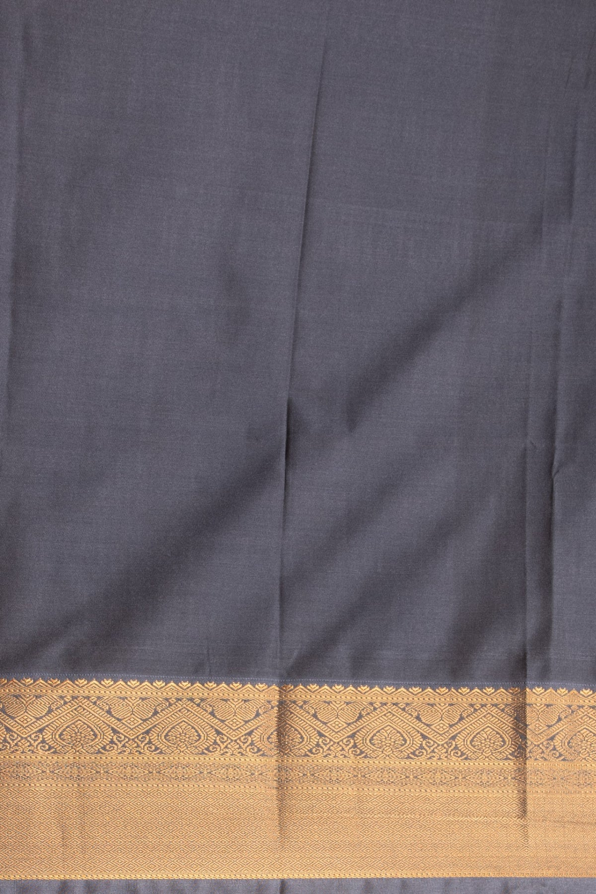 The body is draped in a warm, earthy Mustard Yellow hue, offering a striking yet harmonious contrast to the deep Charcoal Grey border and pallu. The Mustard Yellow field features a very fine, all-over small checks pattern (kattam) woven directly into the fabric, creating a rich, subtle texture that gives the saree its depth and unique hand-feel. The border is clean and features thin strips of metallic gold zari with fine, traditional detailing, framing the body beautifully.The pallu section on the Charcoal Grey ground features a prominent, densely woven diamond or geometric pattern in black/grey thread, offering a matte, architectural look.The outermost edge is finished with a wide, solid band of deep Charcoal Grey, adding a sharp, contemporary definition. Last image shown is the blouse.