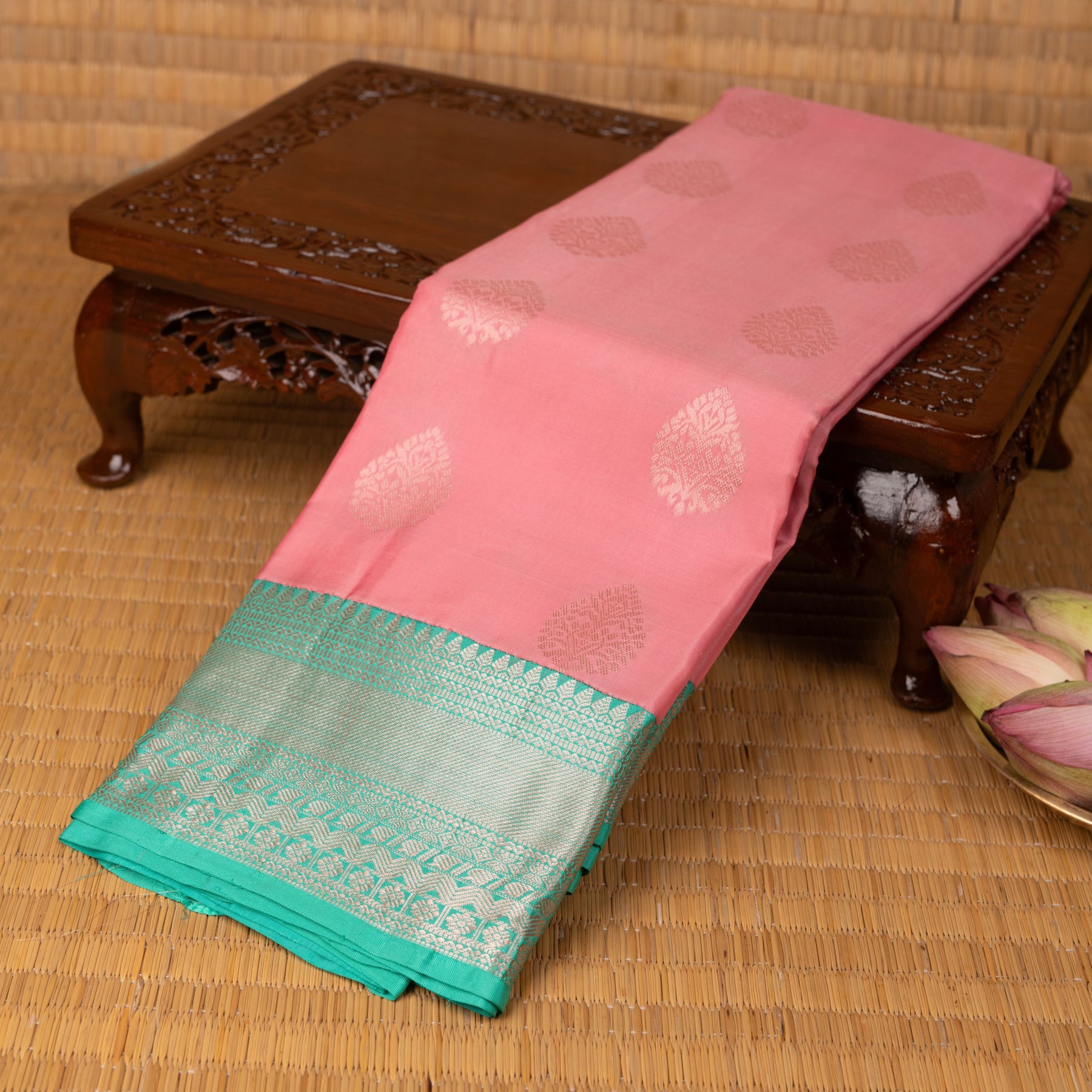 The pink field is elegantly adorned with intricate, leaf-shaped or paisley-style buttis woven in a light gold or silver zari, which shimmer subtly against the soft background.The wide Cyan Blue border is magnificent, featuring a blend of silver and gold-toned zari. The top section features a detailed geometric pattern, while the main body of the border is woven with a fine diamond mesh, creating rich texture and visual interest.The prominent Cyan Blue pallu carries the same intricate mesh pattern as the border, ensuring a cohesive and luxurious drape. The density of the weaving adds significant weight and a rich luster.