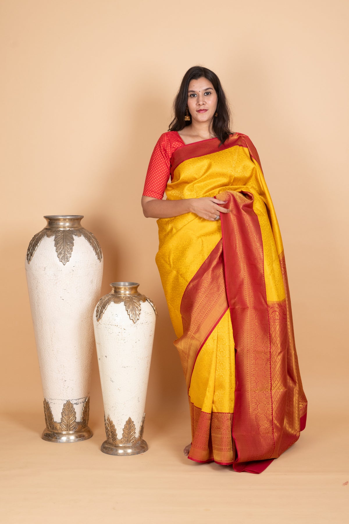 Radiating timeless grandeur, this School Bus Yellow and Red Brocade Kanchipuram Silk Saree is a true heritage piece. The vibrant yellow body is adorned with delicate woven patterns, exuding richness and elegance. Its contrasting deep red border and pallu are intricately detailed with traditional brocade motifs, adding a regal charm. Paired with a matching red blouse, this drape is perfect for weddings, festive occasions, and celebrations, making it a treasured addition to any saree collection.