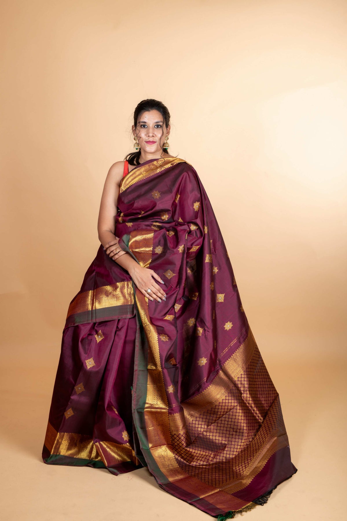 Wine purple kanjivaram silk saree is adorned with diamond and round motifs in gold and silver zari. Border is woven with traditional gold zari pettu with green silk pettu on other side. Pallu is woven with monotone rich weave and monotone blouse.