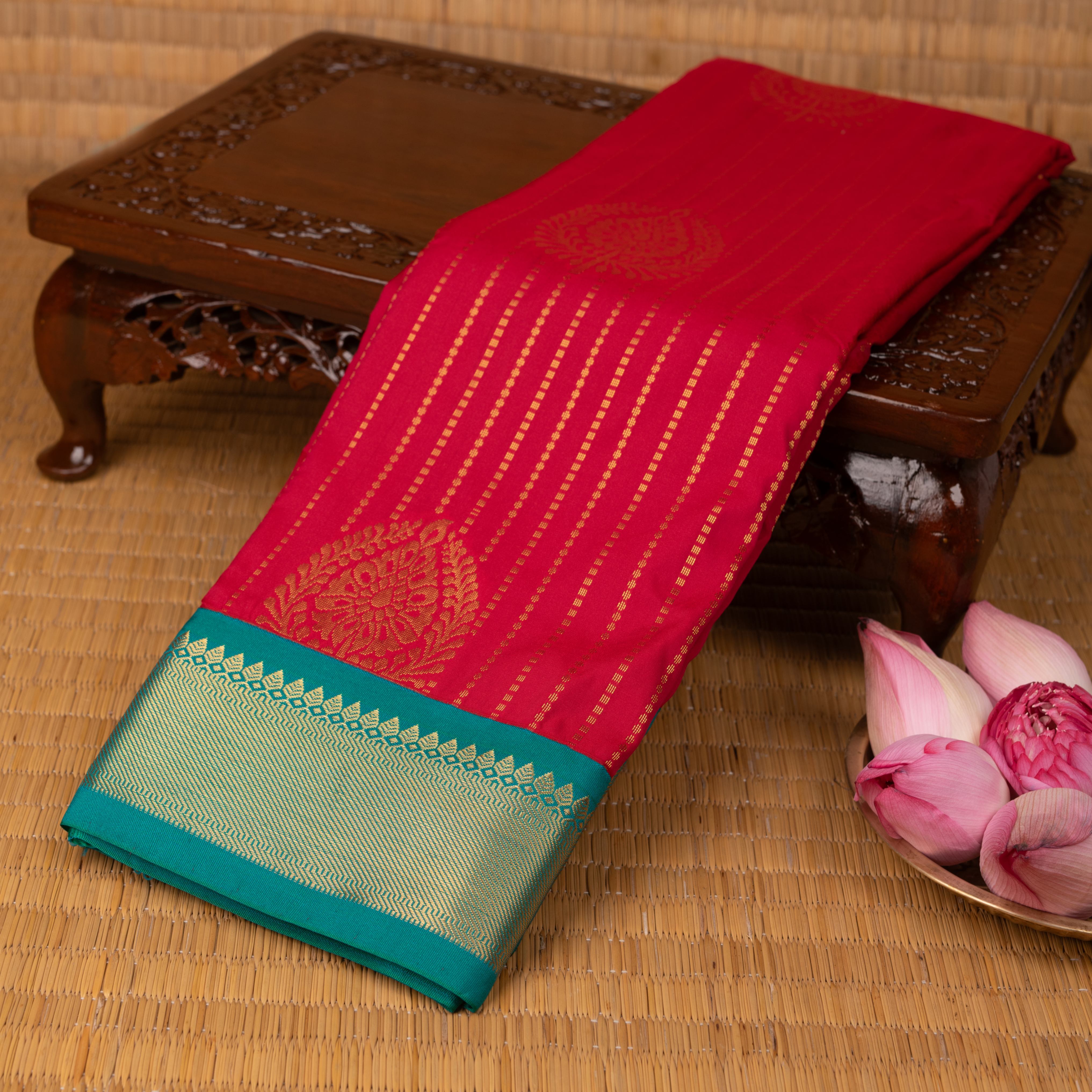 The main field is a dazzling Apple Red. The fabric possesses a luminous sheen.The contrast border is a deep, luxurious Jungle Green which frames the red beautifully.Interspersed among the vertical lines are prominent large, round floral/medallion motifs woven in Gold Zari. These motifs are spaced out, adding pockets of traditional grandeur.
