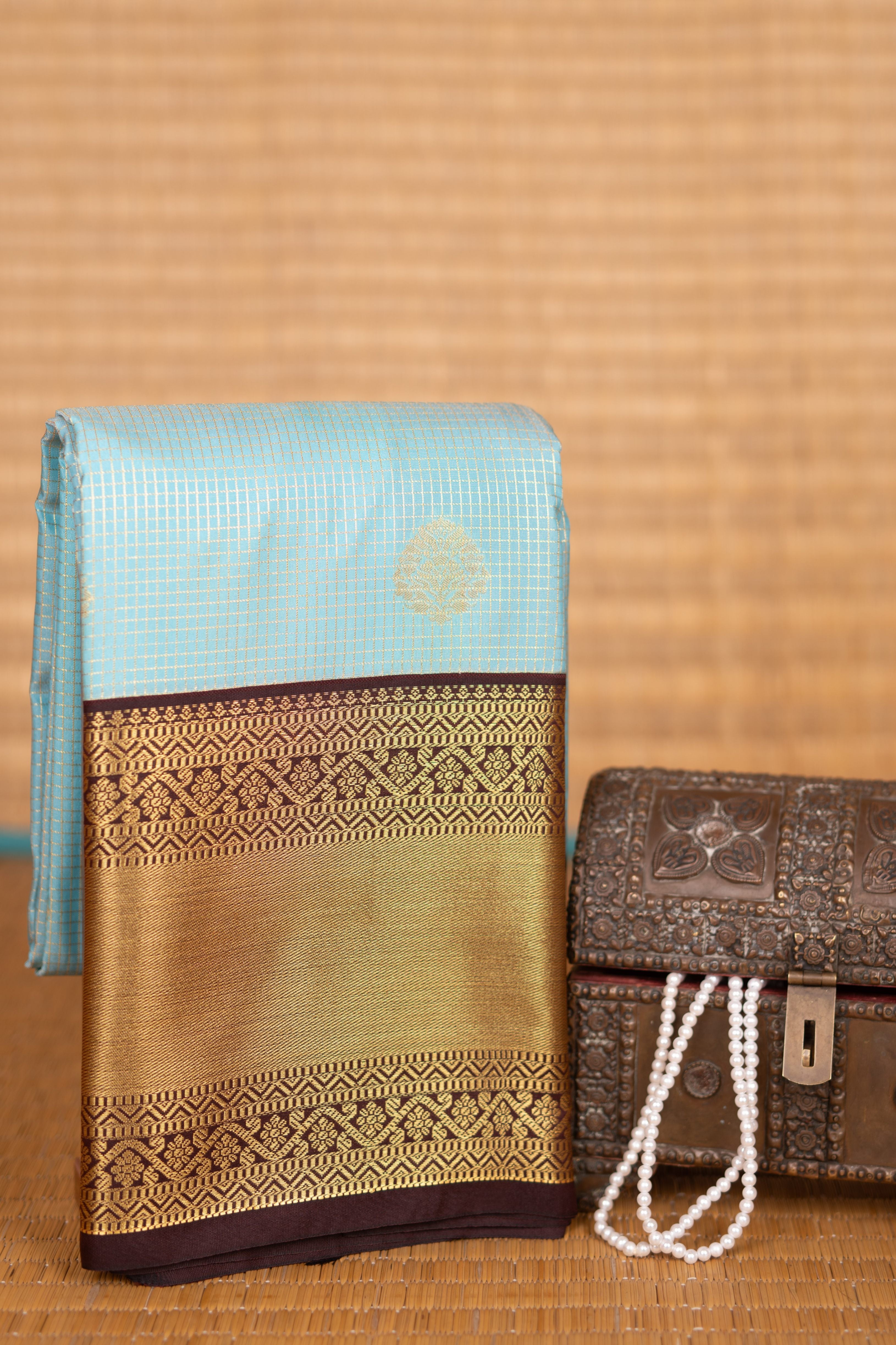 A serene Baby Blue that is both refreshing and eye-catching. The body is intricately woven with a subtle, all-over Gold Zari check pattern (Kattam), giving it a rich texture and glimmer. A broad, luxurious border in deep Chocolate Brown (or rich Coffee Brown), framed by bands of darker silk. The border features a striking combination of weaving.A massive central panel of dense, shimmering Bronze Zari weaving that dominates the look.This is framed by intricate bands of traditional geometric patterns woven in contrasting Gold/Bronze Zari and the Chocolate Brown silk. Kanchi Semi Silk, offering a beautiful, structured drape and a luxurious sheen while ensuring comfort and manageability for all-day wear.Last image shown is the blouse.