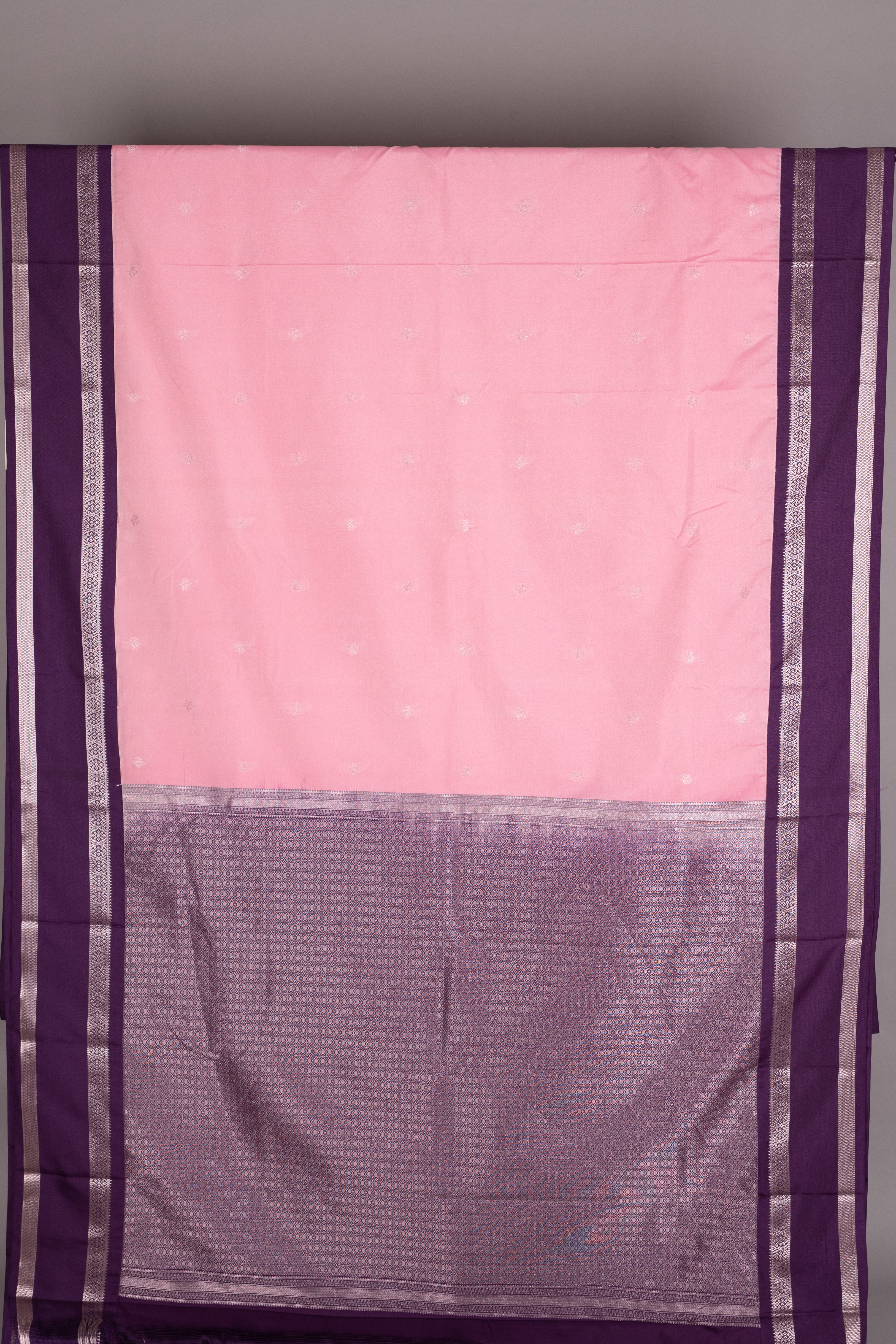 Saree Colour: Baby Pink Zari: Silver Weaving Technique: Korvai Weave Blouse Colour: Purple