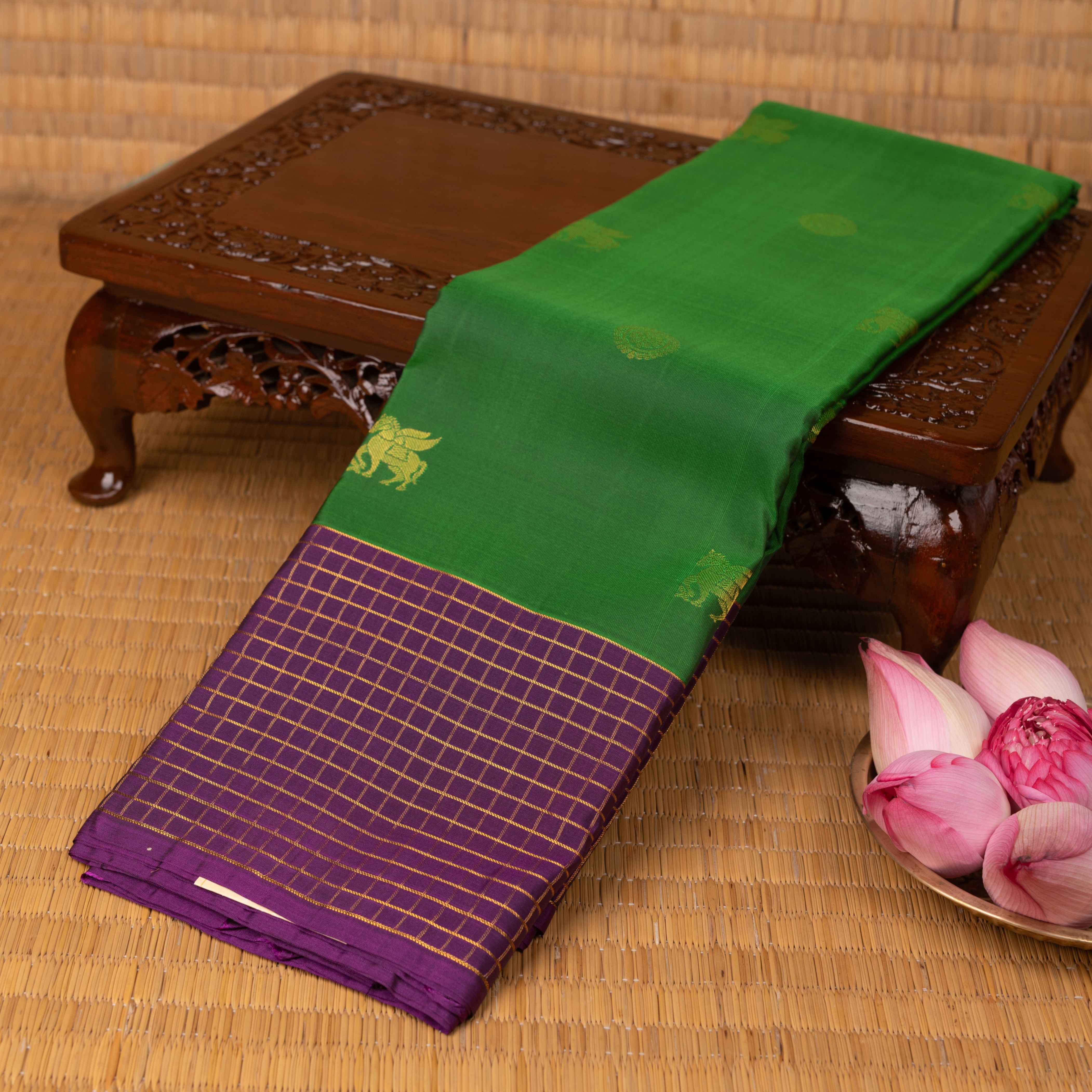 The green body is adorned with a mix of shimmering gold zari motifs, including circular/coin buttas and traditional elephant (gaja) motifs, scattered evenly across the fabric. The broad purple pallu is densely woven with an intricate all-over gold zari geometric or mesh pattern, giving it significant weight, structure, and a magnificent metallic sheen.The border features classic gold zari lines and fine checks (kattam) where the green meets the purple, providing a refined, structured finish.