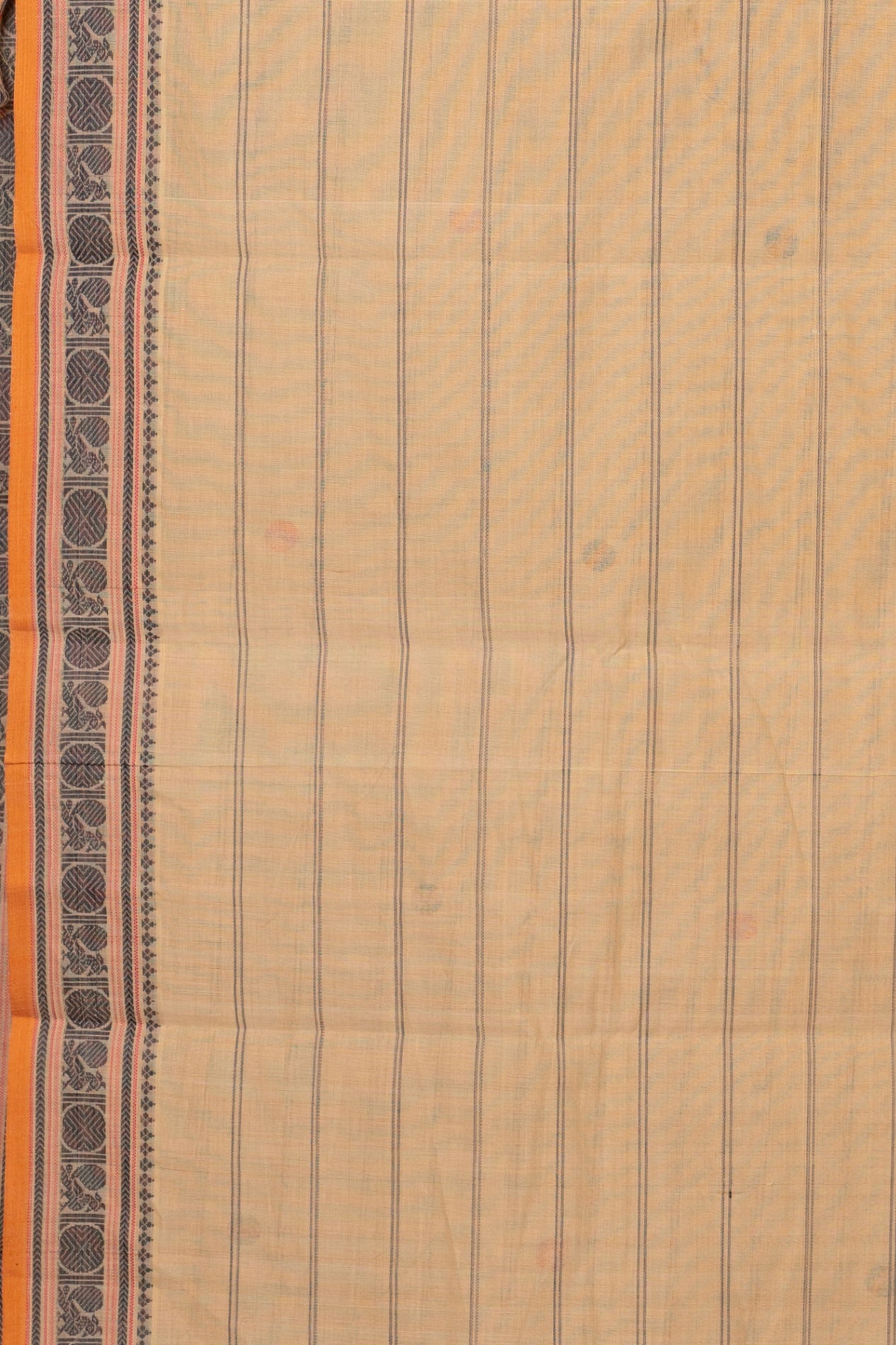 Embrace the elegance of tradition with this exquisite off-white Kanchi cotton saree, a timeless piece that radiates subtle sophistication and cultural richness. The soft off-white base is adorned with neat navy blue horizontal stripes and delicate woven buttas in red, navy, and beige, offering a graceful contrast that enhances the overall design.The saree’s intricately designed border and pallu feature classic Kanchi temple motifs in dark blue, framed by fine orange piping at the edge, adding a vibrant finish to the understated palette. Woven from premium quality cotton, this saree is lightweight, breathable, and perfect for day-long wear—ideal for traditional events, temple visits, or elegant casual outings.