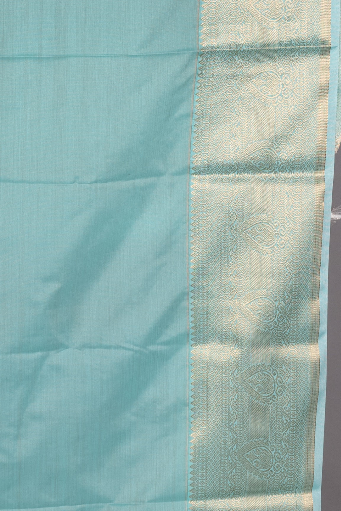 This is a striking soft silk saree featuring a dramatic Jet Black body and a broad, contrasting Ice Blue/Baby Blue border.The black field is adorned with small, scattered gold zari tear-drop buttas and a large central gold zari medallion. The wide pale blue border is heavily woven with intricate Silver or Pale Gold Zari traditional patterns.The saree offers a sophisticated look by blending traditional artistry with a bold, contemporary color contrast.