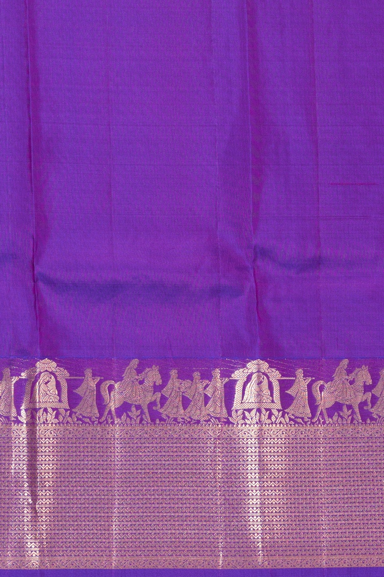 A mesmerizing, deep Blue Violet saturates the silk, creating a striking and unique jewel tone. The body is subtly adorned with delicate zari buttas (motifs) scattered throughout. The saree is heavily framed by magnificent Silver-Gold Zari borders that lead into the spectacular pallu (shoulder drape). The zari has a distinct glow, often appearing silver or antique gold, lending immense richness. The expansive borders and pallu are woven with the traditional Oorvalam theme, featuring intricate designs of figurines, mythical animals, temple motifs, or palanquins, which symbolize the richness and auspiciousness of a traditional wedding procession. Blouse worn by the model is...