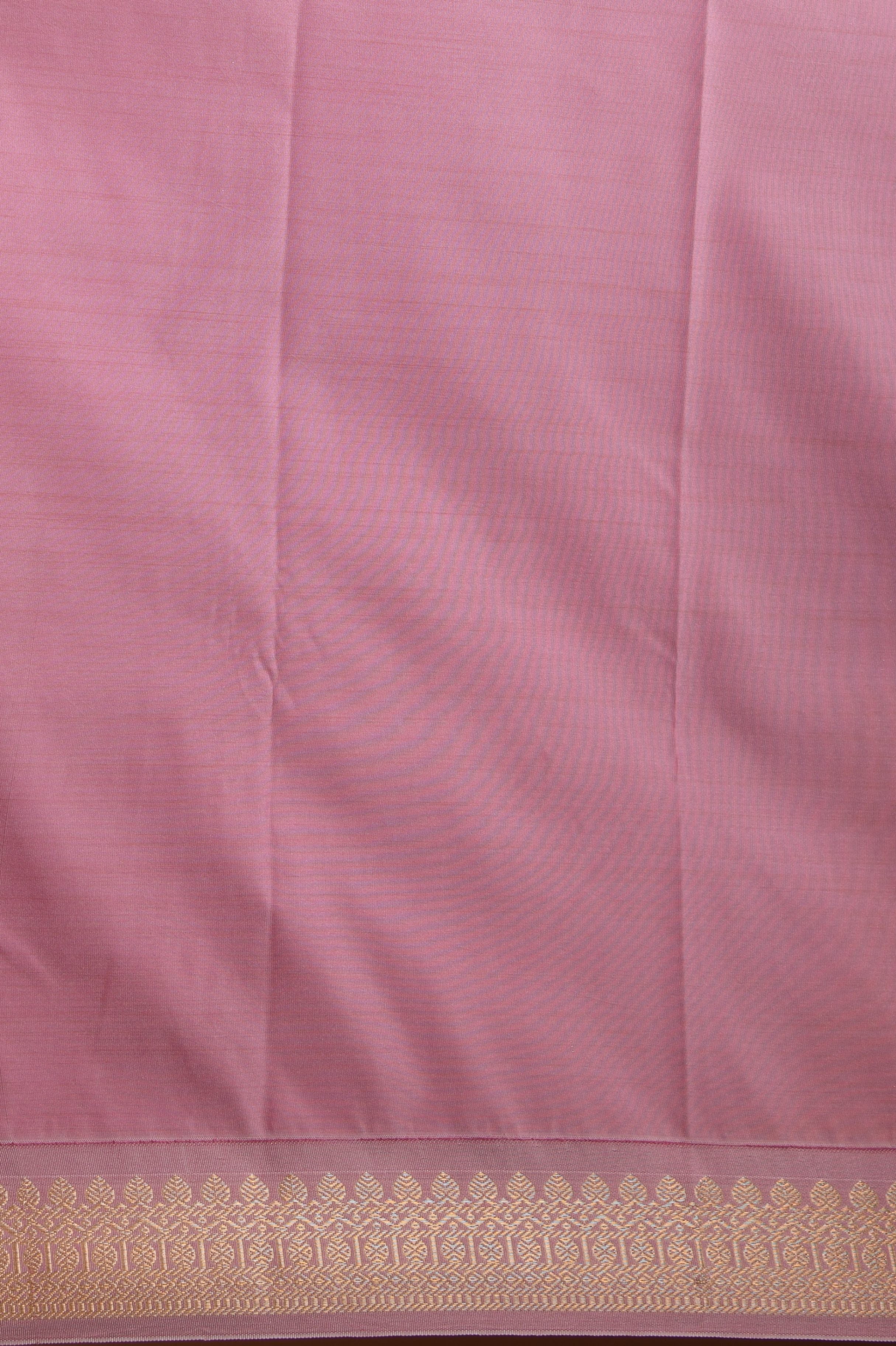 Border: A sleek, contrasting Pastel Pink small border featuring a minimalist gold zari pinstripe and a traditional textured edge. Pallu: A grand and heavy gold zari pallu on a pastel pink base, showcasing dense geometric and floral weaving for a radiant, metallic finish. Last image shown is the blouse.