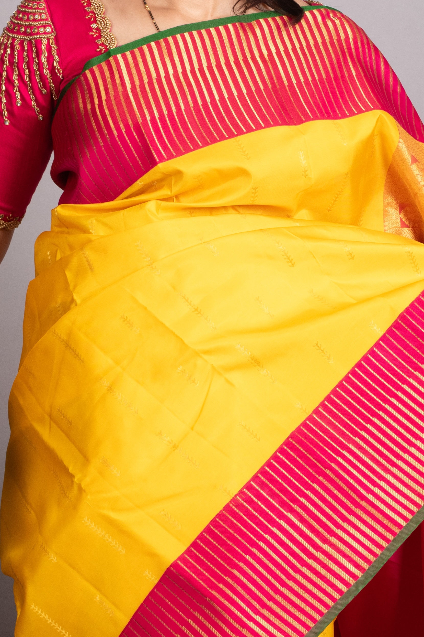 Saree Colour: Bright Yellow Zari: Gold Weaving Technique: Traditional Weave Blouse Colour: Raspberry Pink