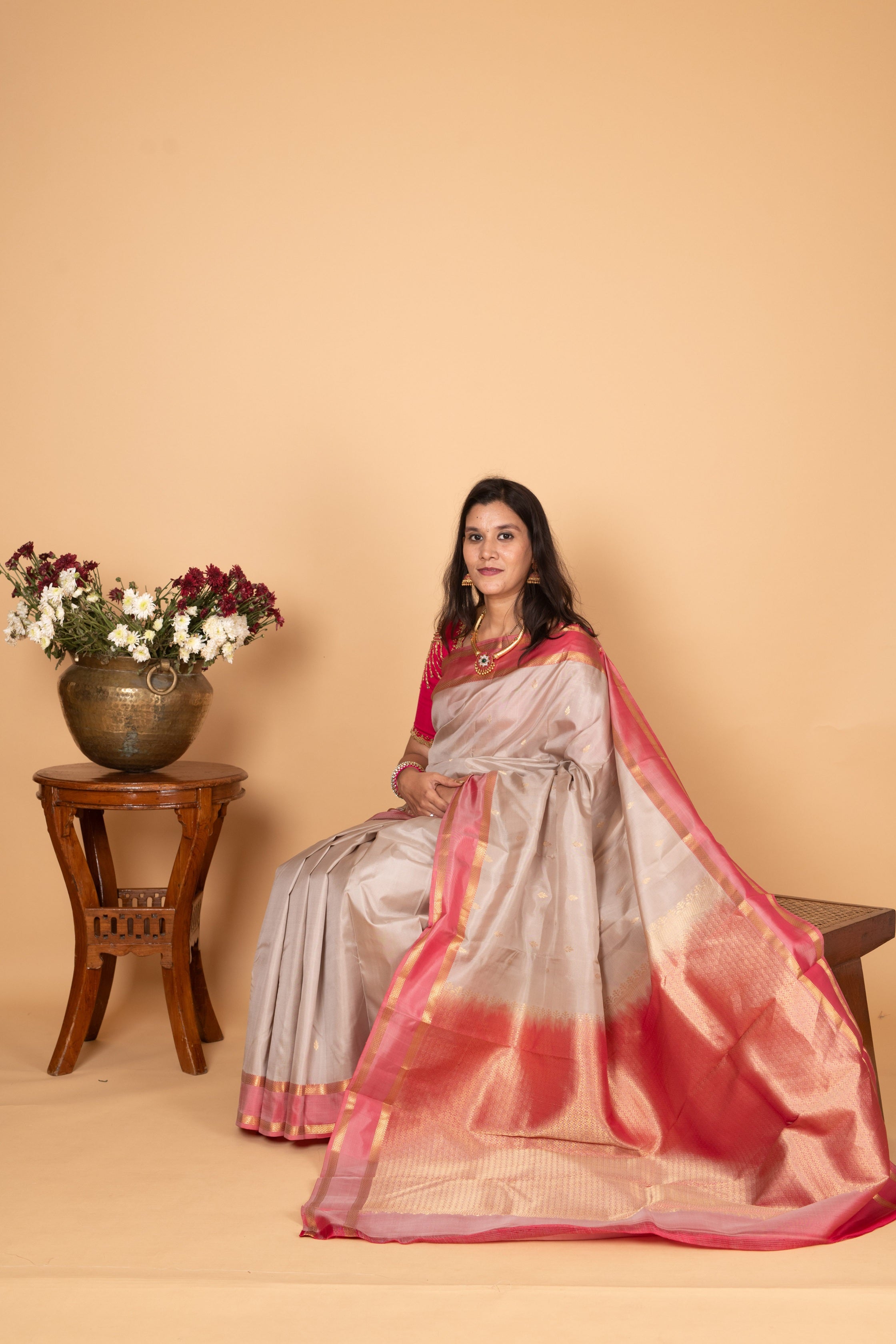 Cement Grey and Dual Tone Pink Pure Kanjivaram silk saree