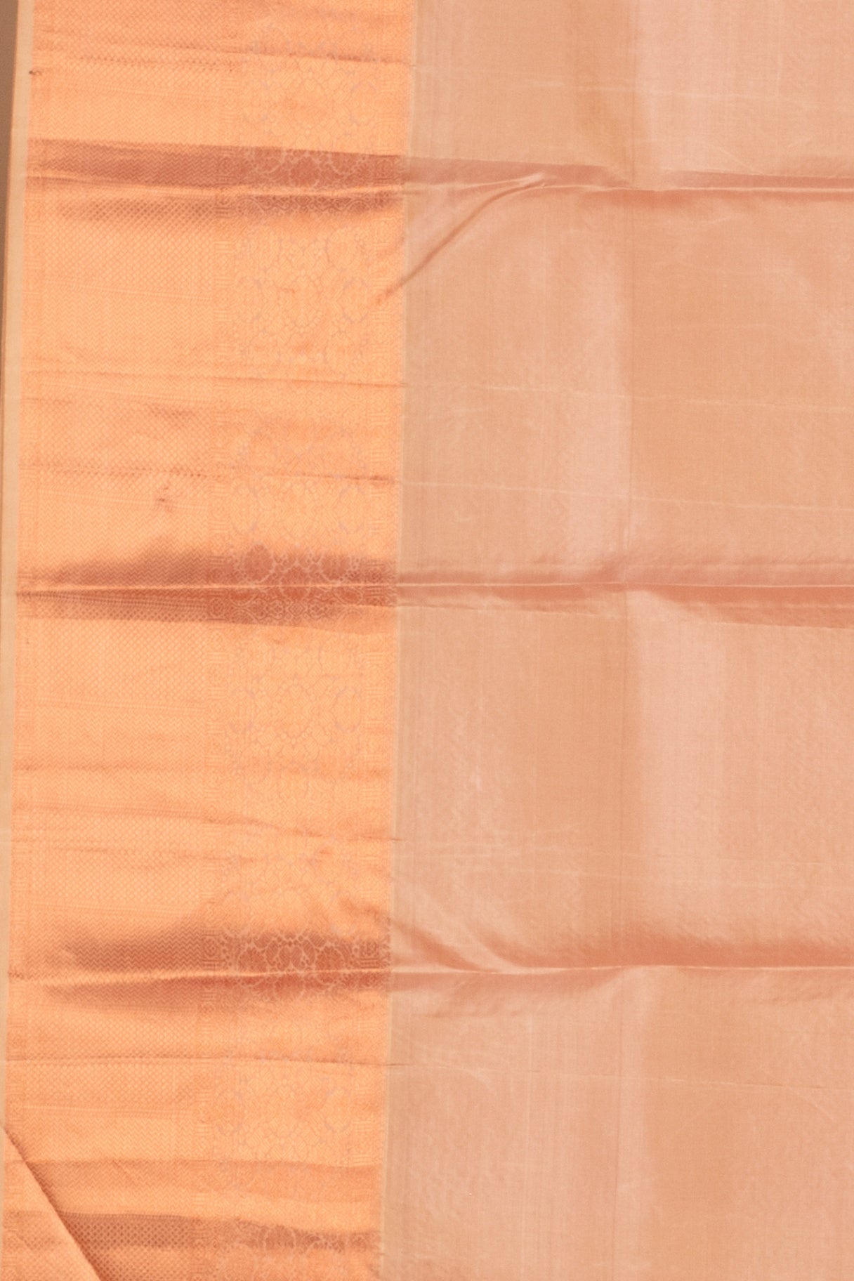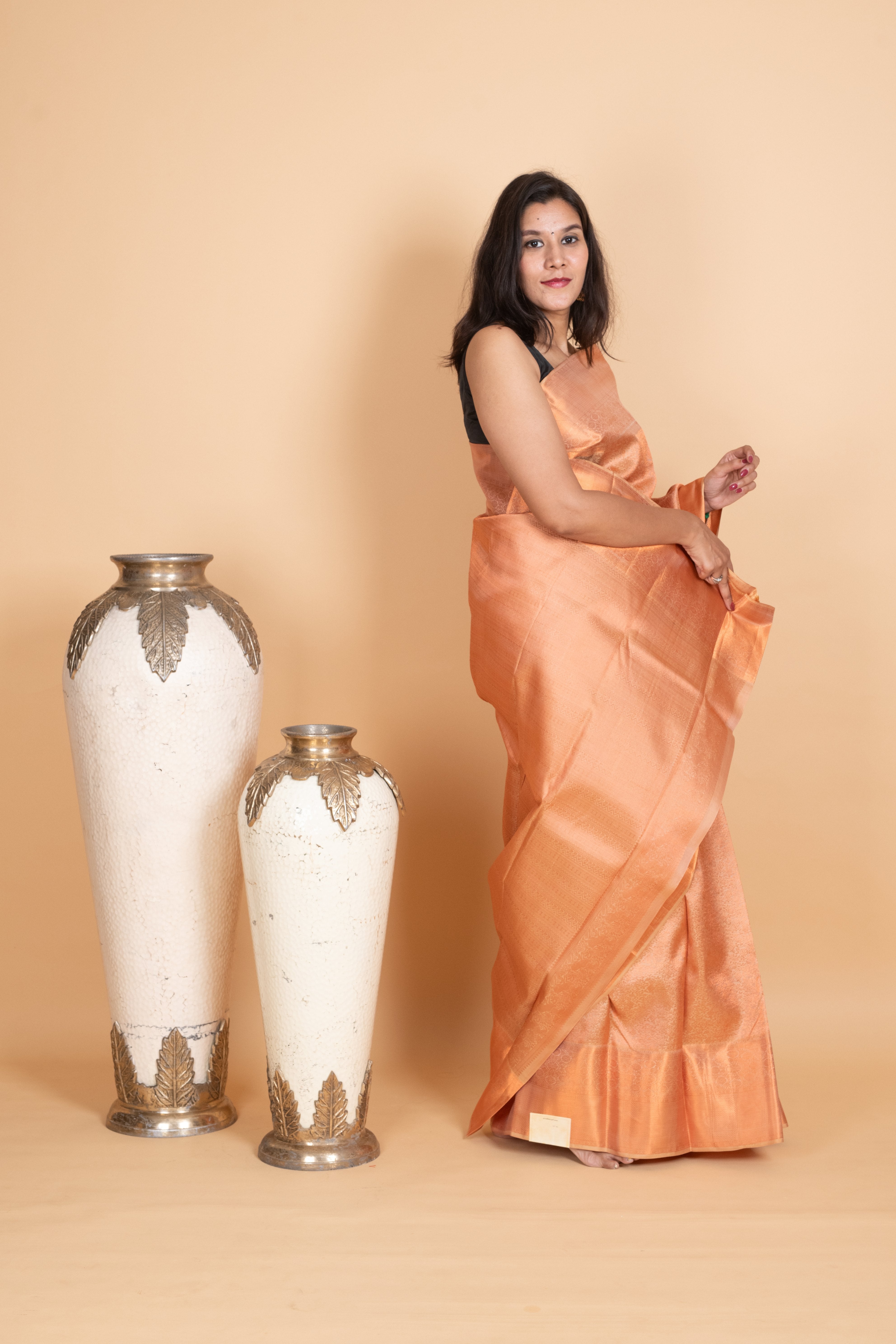 Drape yourself in sheer radiance with this magnificent Zari Brocade Silk Saree. The hue is a luxurious blend of Champagne and Apricot, woven through with shimmering Rose Gold Zari that bathes the fabric in a rich, warm light. The entire body is rendered in a fine, detailed brocade pattern—a self-woven masterpiece that catches the light with a soft, metallic sheen. Without a contrasting border, the saree is a seamless waterfall of opulent color and texture, making a grand, monochromatic statement. This is an essential piece for any momentous occasion, promising an entrance that is both regal and breathtaking.