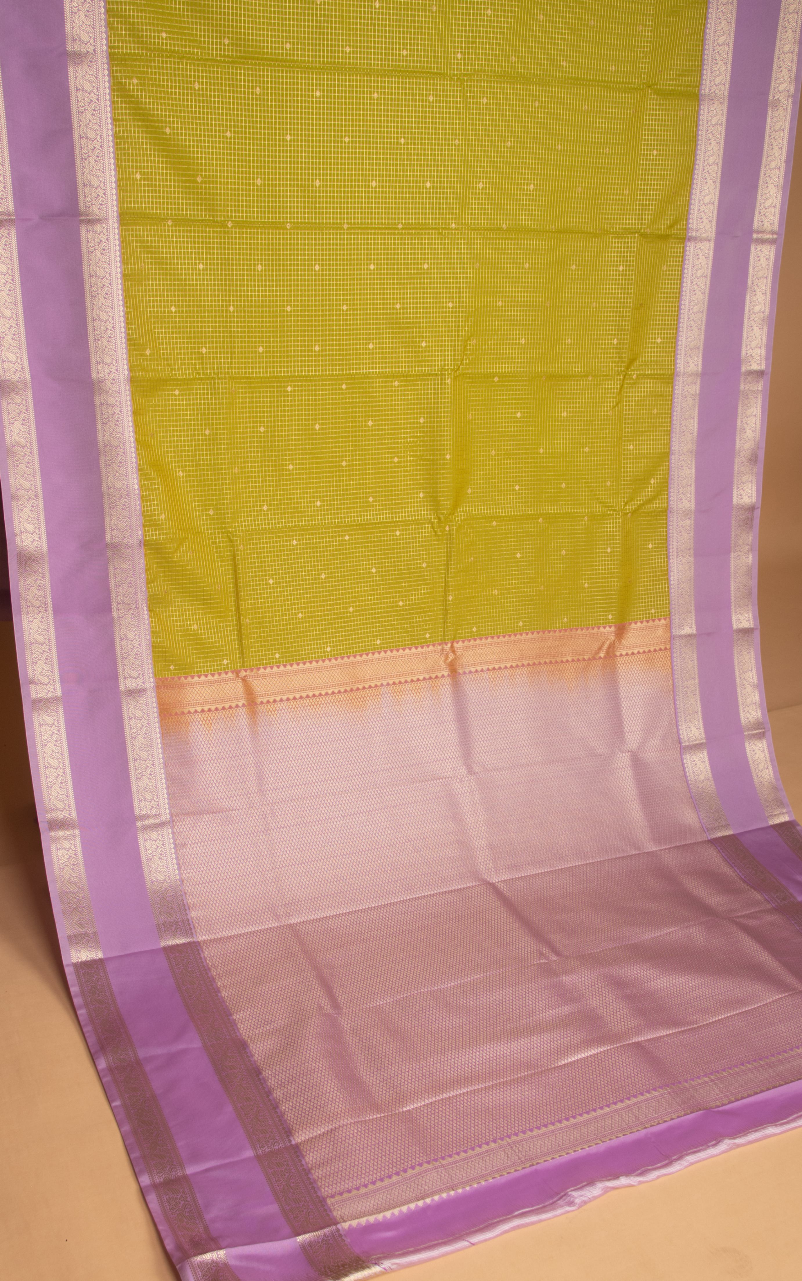 The entire Chartreuse Green body is intricately woven with a fine self-color check or square grid pattern. The weave gives the fabric a beautiful texture and a shimmering, almost metallic luster, allowing the vibrant green to truly pop. Lilac Border: The edge features beautiful parallel bands of Silver Zari weaving, providing a luxurious finish against the soft lilac base. The pallu is a masterpiece, showcasing a lovely color gradient transition from a subtle pink/peach hue into the main Lilac tone. The body of the pallu is woven with a dense, subtle self-pattern in rose gold Zari, giving it a rich...