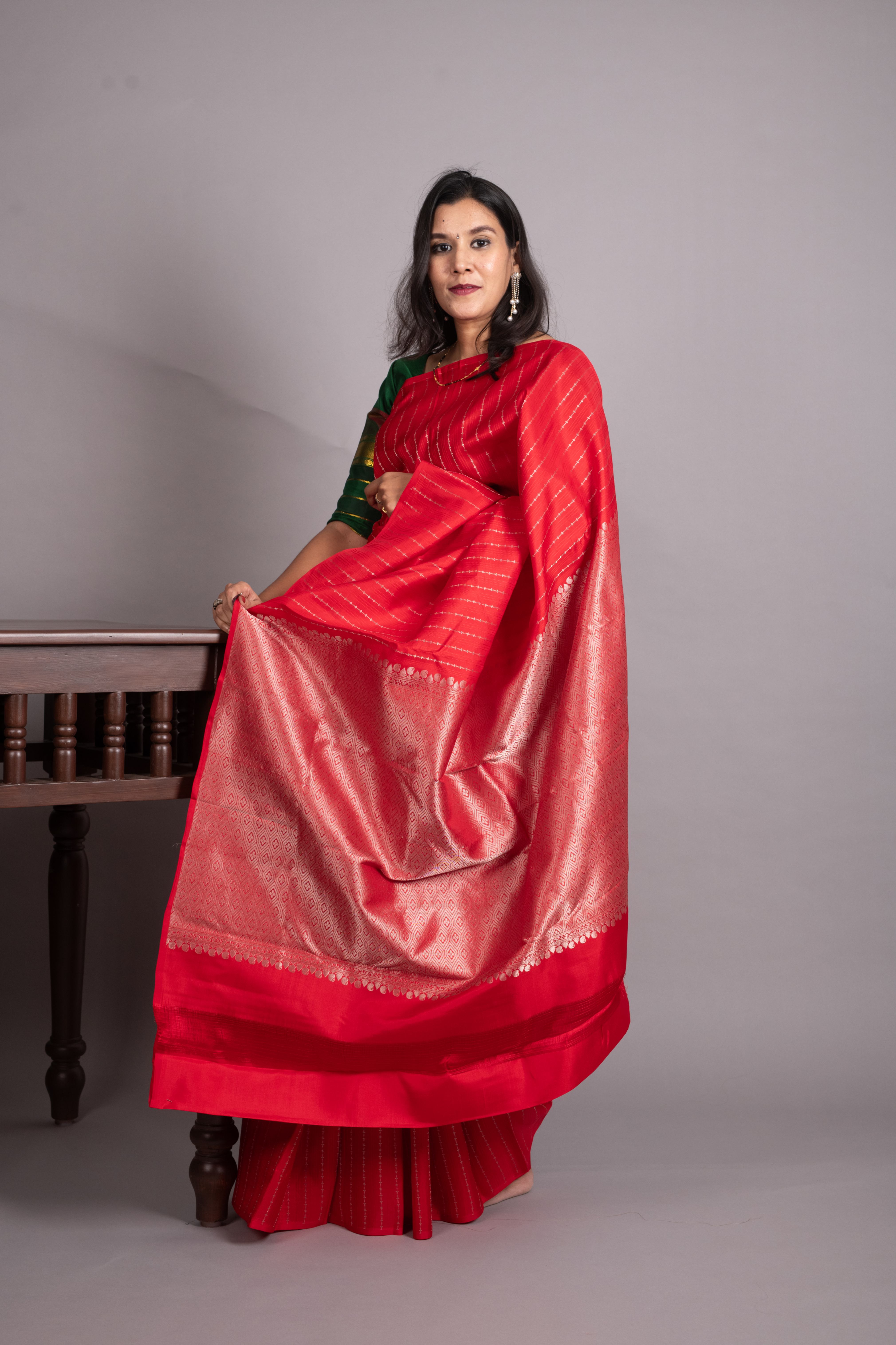 Saree Colour: Chilli Red Zari: Silver Weaving Technique: Borderless WeaveBlouse Colour: Chilli Red