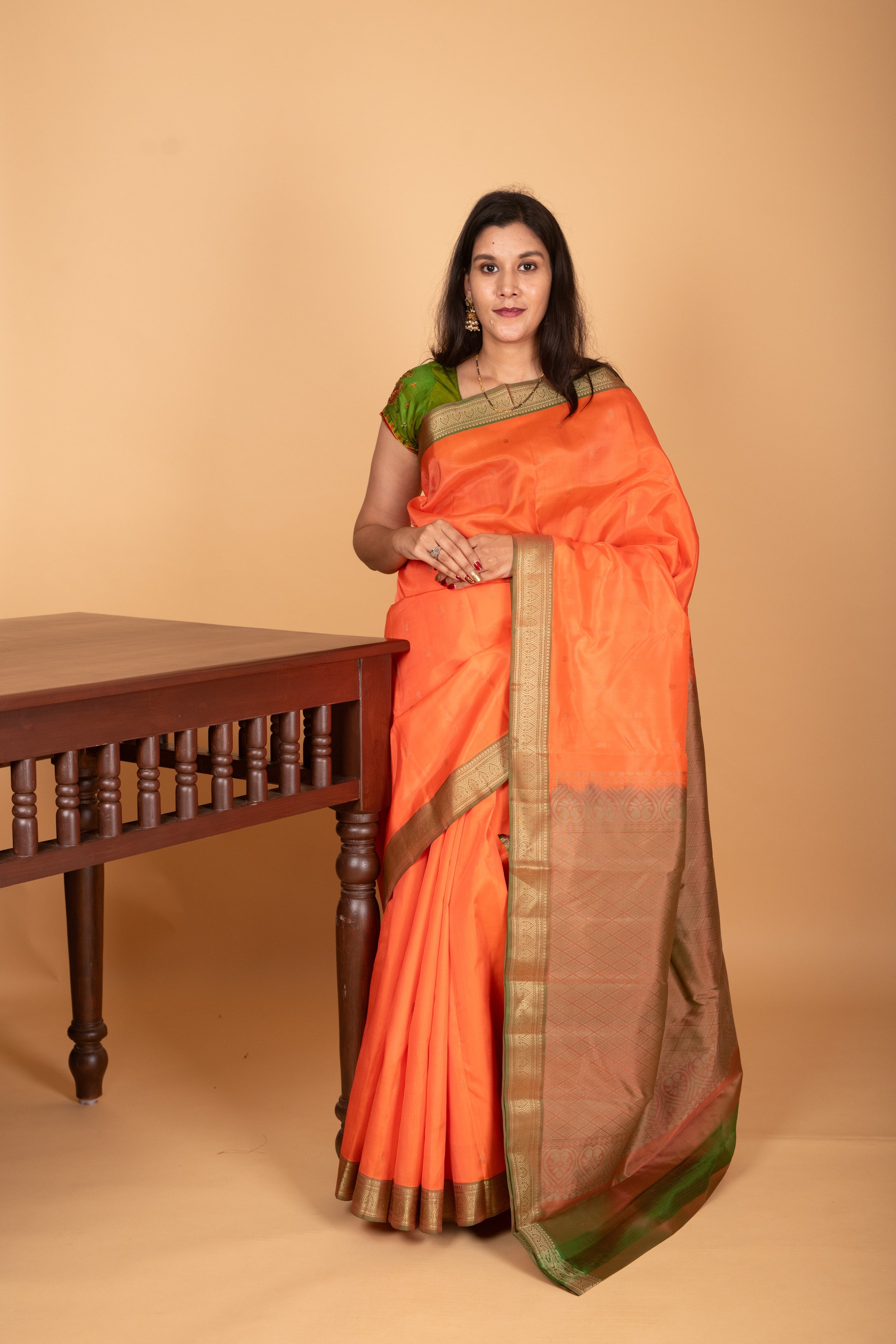 Saree Colour: Coral Orange Zari: Thread Weaving Technique: Thread weave Blouse Colour: Dual Tone Green