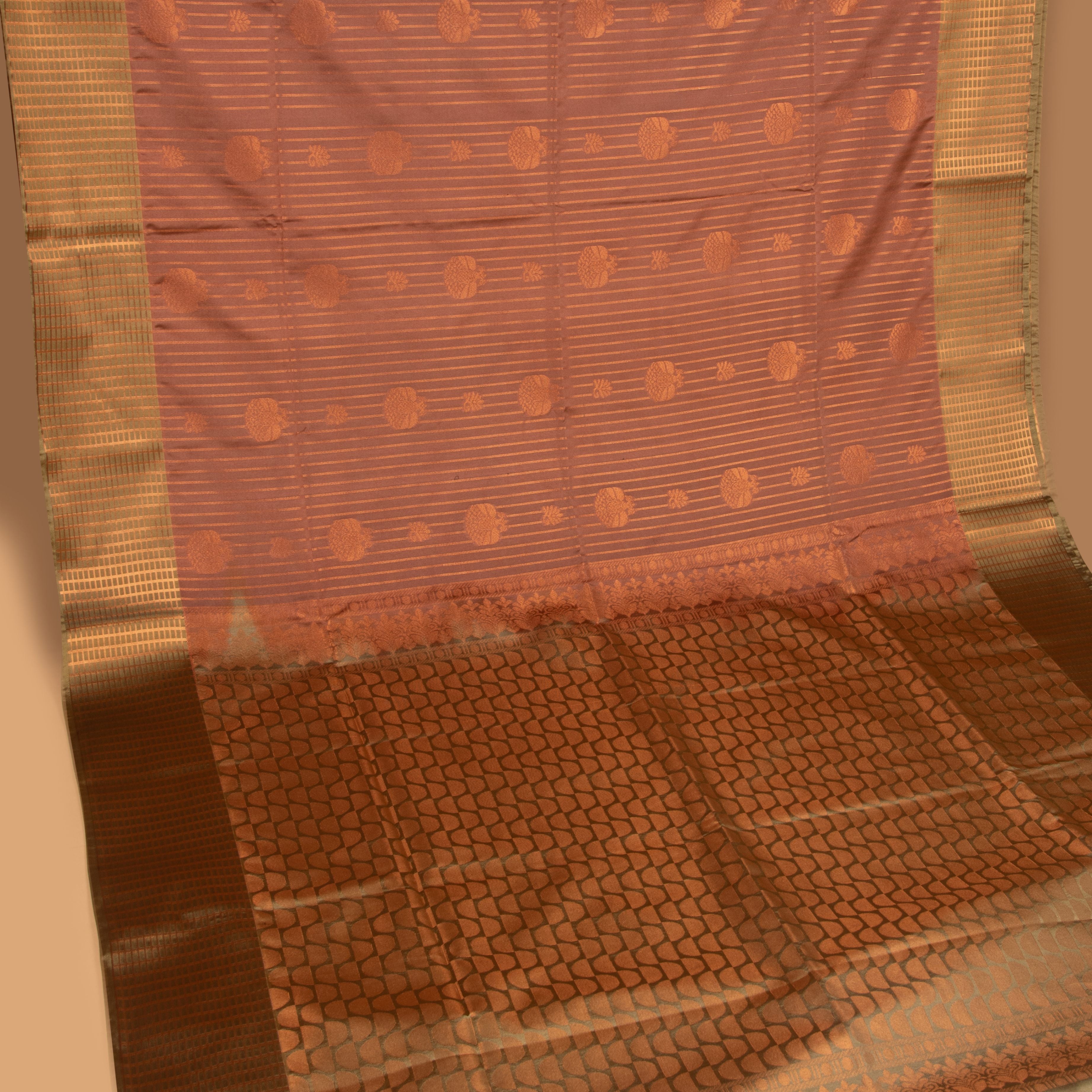 Saree Colour: Coral pink Zari: Rose gold Weaving Technique: Korvai Weave Blouse Colour: Tea green