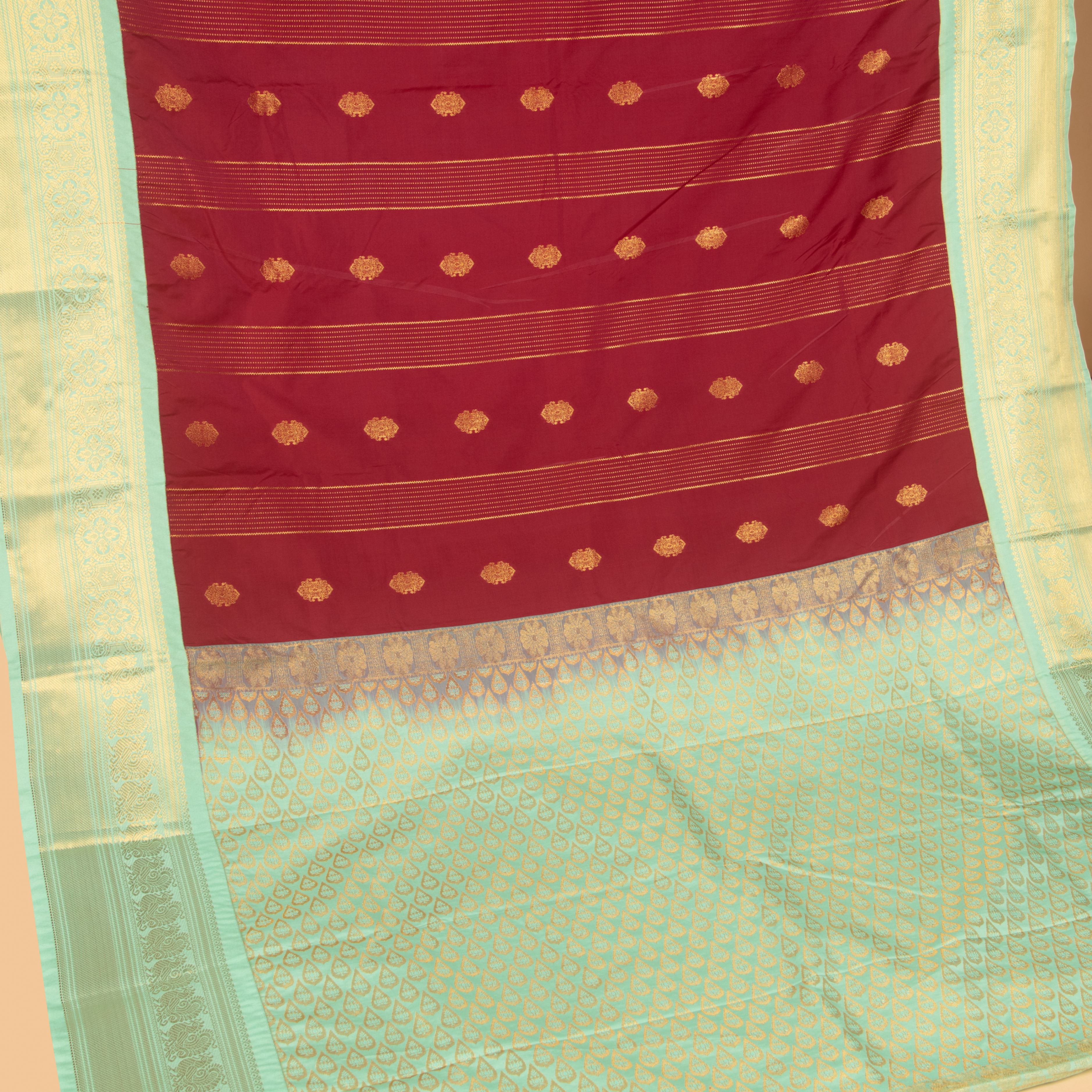 Saree Colour: Dark red Zari: Gold Weaving Technique: Butta Weave Blouse Colour: Pastel green