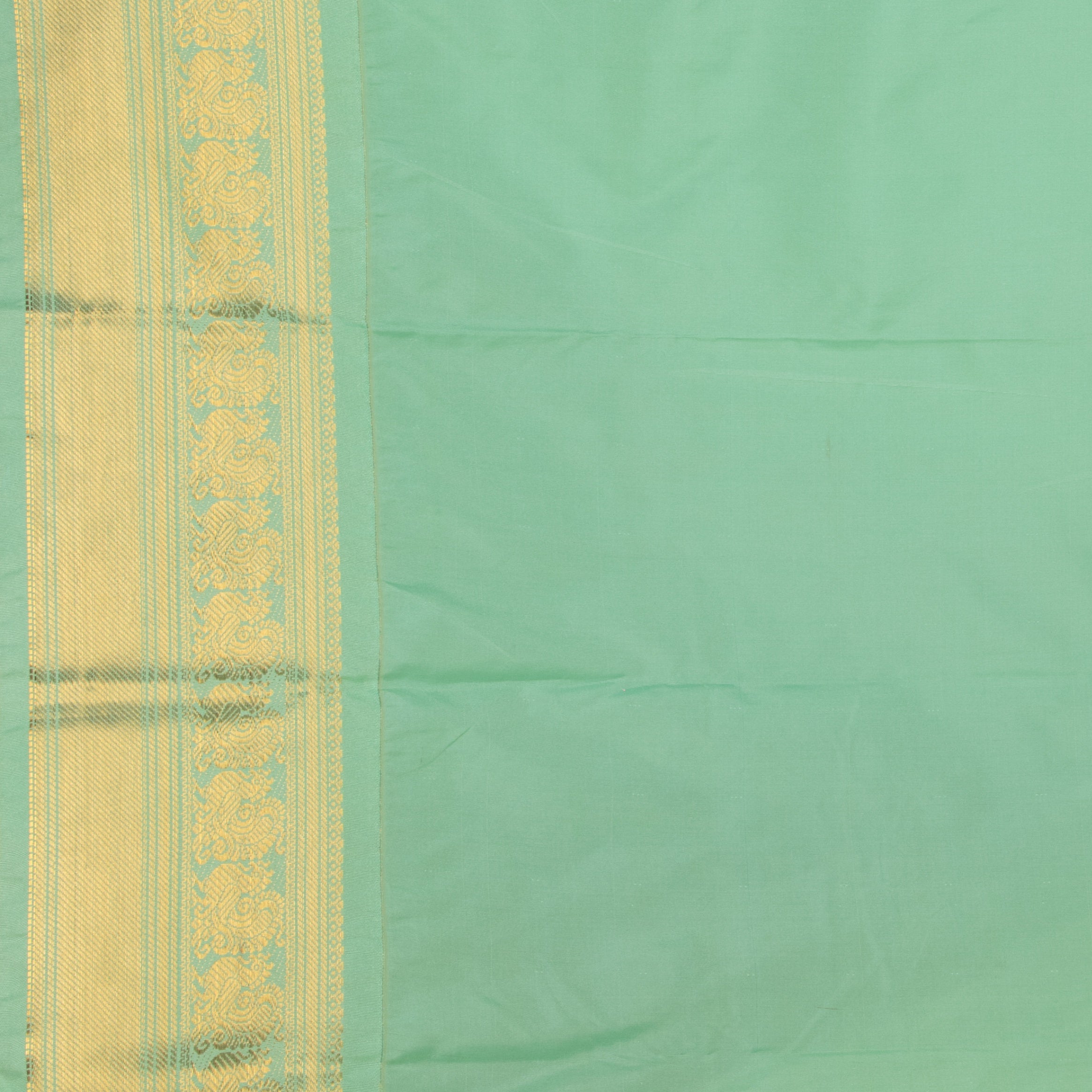 A rich, deep Dark Red.A soft, serene Pastel Green provides a refreshing contrast.Horizontal Lines: Bands of fine, woven Gold Zari stripes run horizontally across the fabric.Circular Buttas: Spaced-out circular or coin-shaped motifs in Gold Zari are placed between the zari line bands.