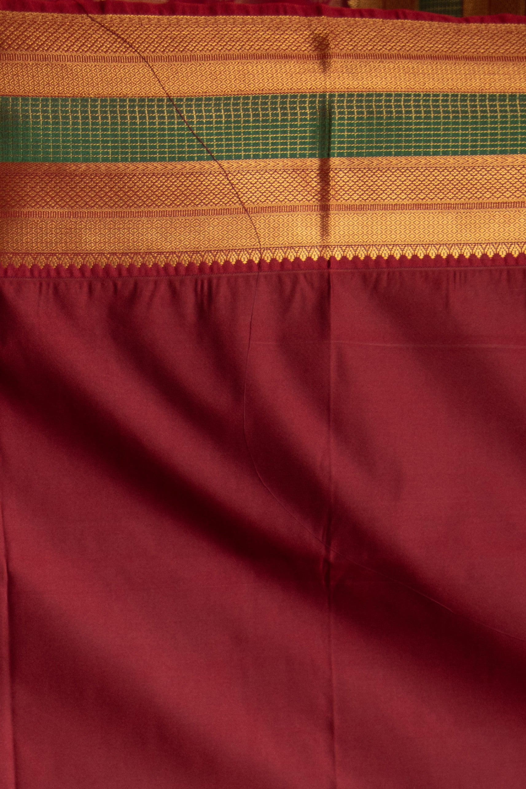The dual-tone body of the saree has an ethereal shimmer and is adorned with delicate, all-over weaving. The design consists of fine, rhythmic geometric patterns (such as checks or diagonal lines) interwoven with subtle floral buttas, creating a richly textured surface that enhances the silk's natural sheen. The Maroon border is wide and features a traditional temple or rudraksha motif at the edging, followed by a band of fine geometric or vine weaving. The contrasting Maroon pallu is a masterpiece, richly woven with intricate bands of pure Gold Zari work, showcasing classic patterns like geometric stripes, adding regal grandeur to...
