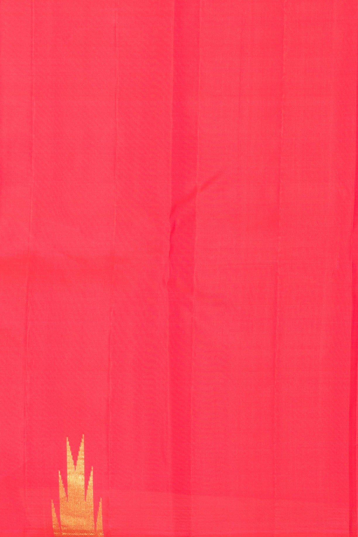A brilliant Dual-Tone Pink creates a luminous effect, where the color depth changes based on the light and drape, ranging from a vivid Rani Pink to a rich Fuchsia. The dual-tone effect adds a luxurious, almost iridescent glow. The saree is framed by broad, opulent Rich Gold Zari borders that transition into a magnificent pallu (shoulder drape). The zari work is dense and features bold horizontal stripe patterns, characteristic of traditional temple styles. The borders often feature a serrated or pointed edge pattern (known as the Temple border or Kumbam motif) where the body meets the border, symbolizing the towers...