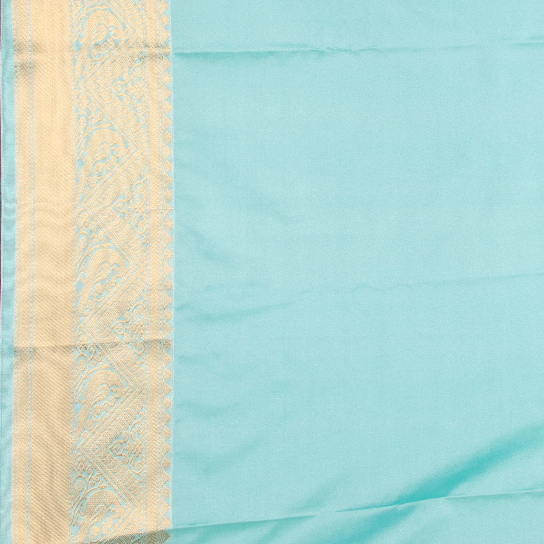The dusky rose field is woven with a subtle vertical stripe texture interspersed with delicate gold or copper zari buttas (circular dot motifs), adding gentle shimmer and texture across the drape.The broad Ice Blue border and pallu feature bands of traditional patterns:The Ice Blue section is highlighted by woven bands of gold or champagne zari, adding a metallic glow that brightens the cool-toned border.