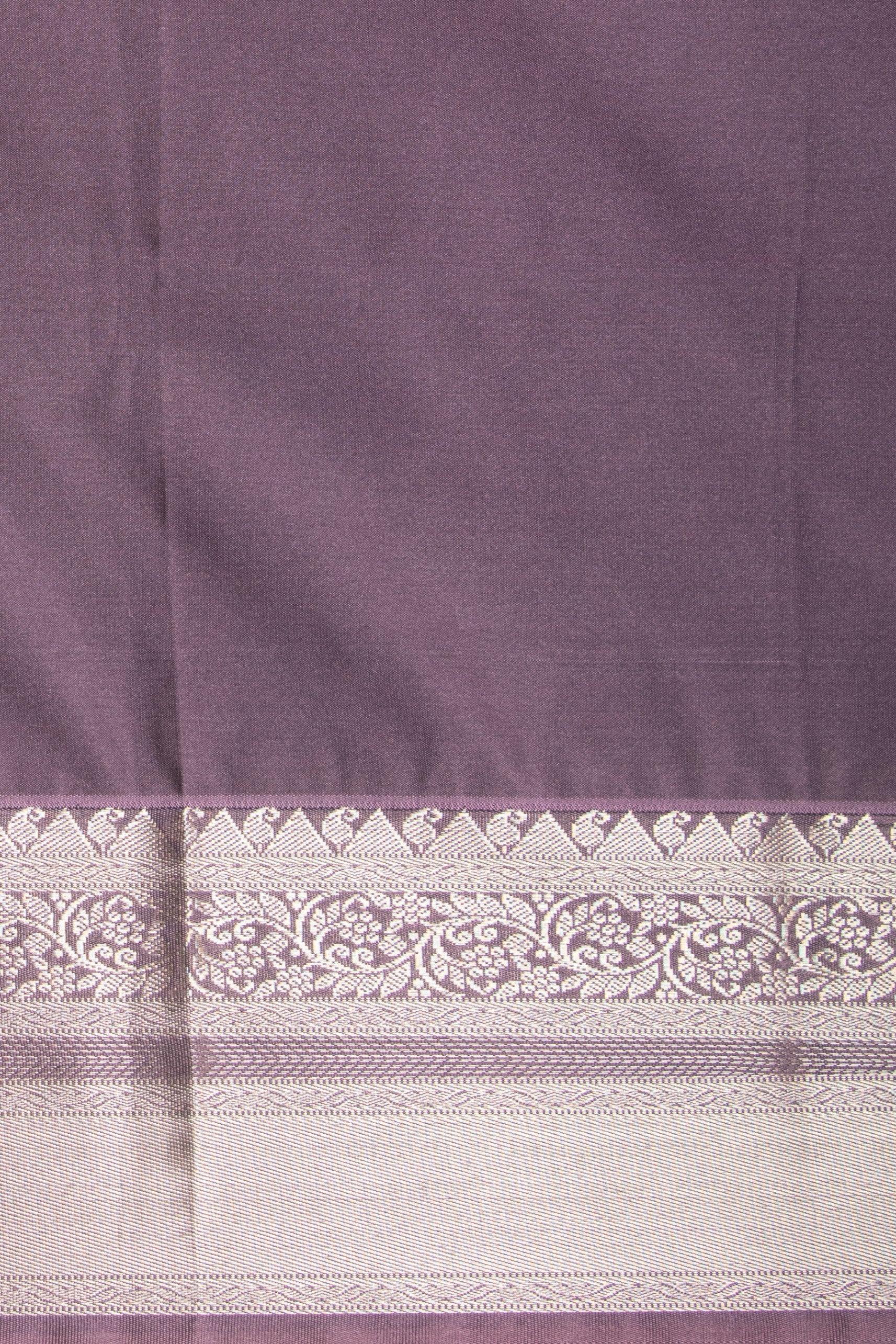 The Pale Cream body is delicately woven with the classic Vairaoosi (diamond needle) pattern. This distinctive weaving features fine, close-set vertical stripes that run continuously, interspersed with subtle, self-color or pale silver floral buttas (motifs). This dense yet soft texture gives the fabric a gentle, structured feel and an ethereal gleam. The border is intricately woven with traditional patterns like stylized peacocks, geometric links, or rudraksha motifs in shimmering Silver Zari against the deep lavender/plum base. A unique touch is the presence of contrasting grey or muted color bands within the border design. The pallu is the centerpiece, rendered in a luminous Dusky Lavender. It features broad, multi-layered bands of intricate diamond or geometric weaving, interspersed with rich horizontal lines and traditional designs, all rendered in sparkling Silver Zari. This heavy, structured weaving creates a magnificent metallic finish. Last image shown is the blouse.