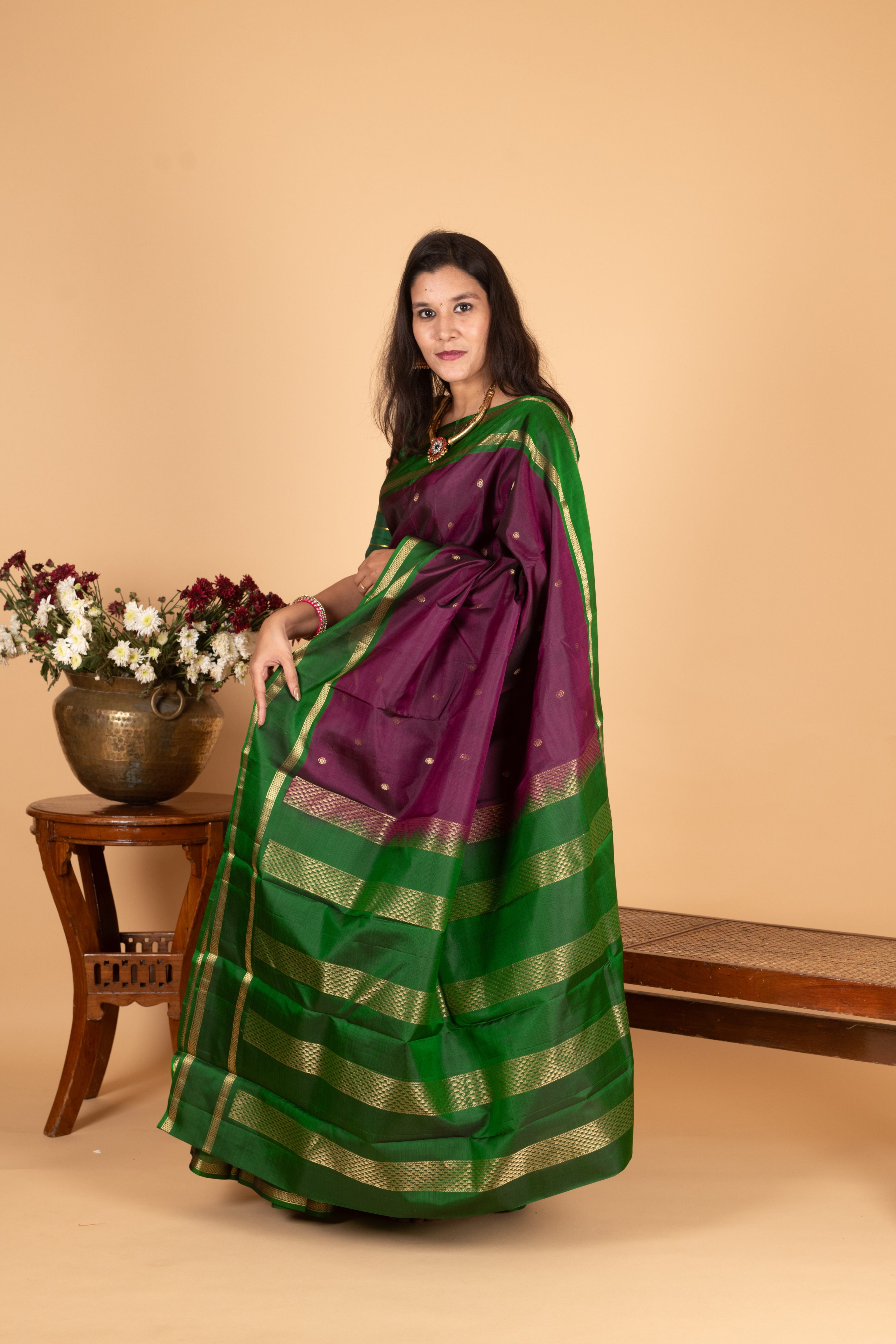 The saree features the classic Korvai technique (a contrast border weave) that seamlessly joins the two dominant colors. The purple field is subtly adorned with delicate, small gold Zari buttis scattered throughout, providing a gentle shimmer.he bold Bottle Green border and pallu are richly detailed with elegant, linear Gold Zari stripes and geometric bands, emphasizing the traditional structure and offering a grand, impactful look.
