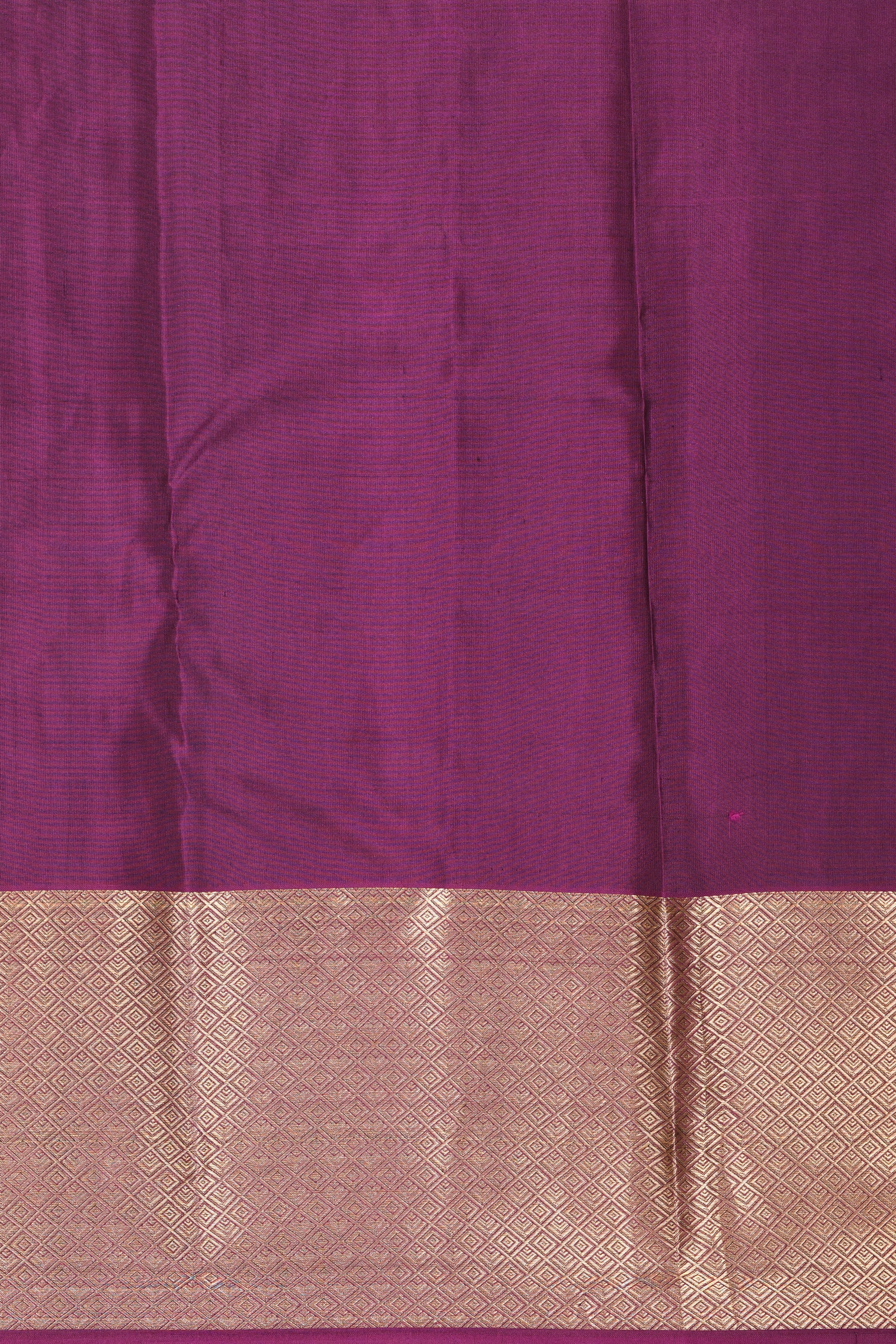 The body is meticulously woven with fine, needle-thin golden zari lines (Vaira Oosi), which run vertically to create a shimmering, textured effect that captures light beautifully. A vibrant, jewel-toned green base that radiates elegance and provides a stunning contrast to the purple accents. A thick, royal Mulberry Purple border enriched with dense, traditional golden zari work, adding a majestic structural frame to the drape. The transition between the green body and the purple border is marked by a subtle purple piping, showcasing authentic handloom craftsmanship. The saree concludes with a grand purple pallu drenched in intricate gold zari, designed for...