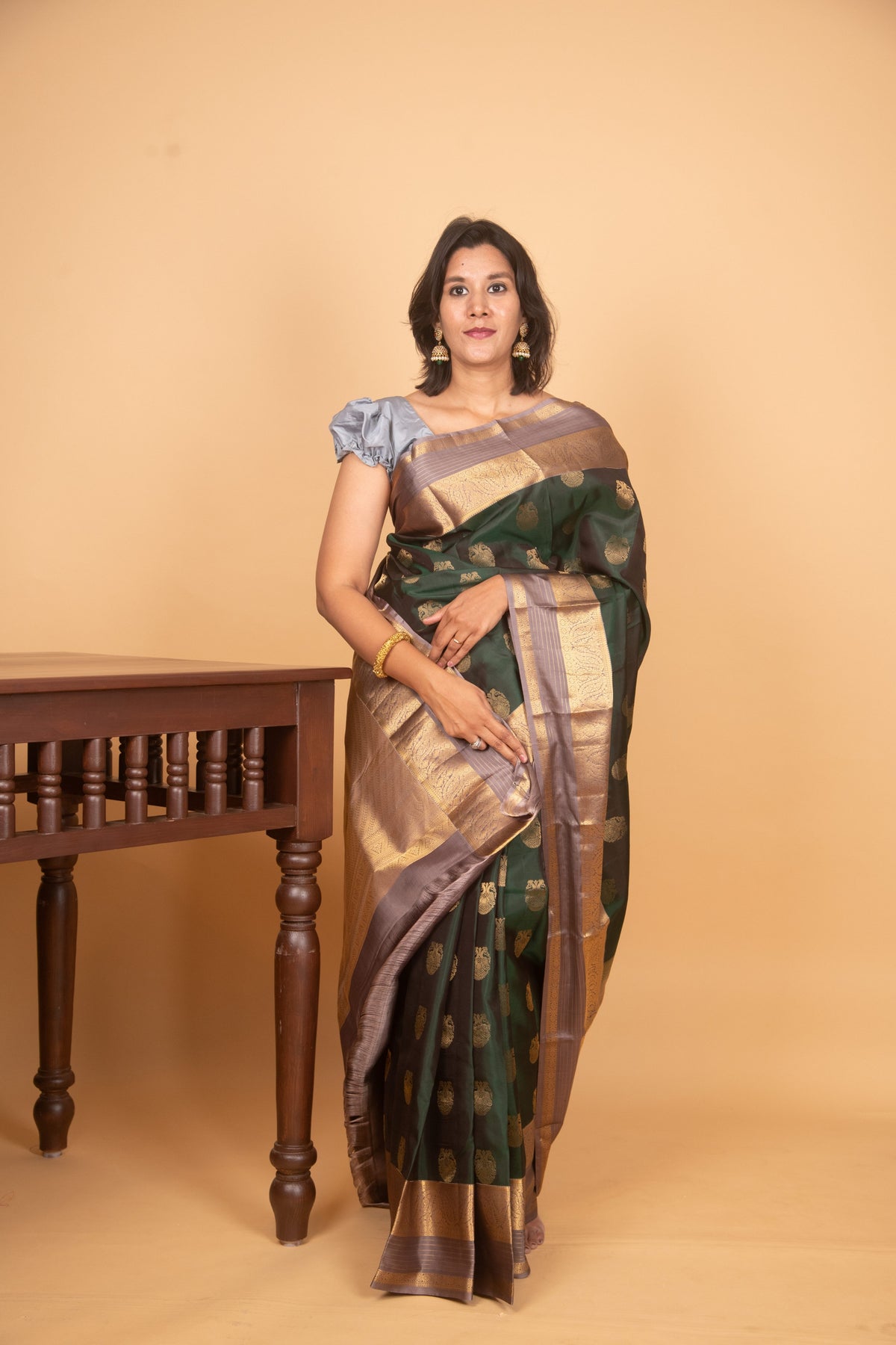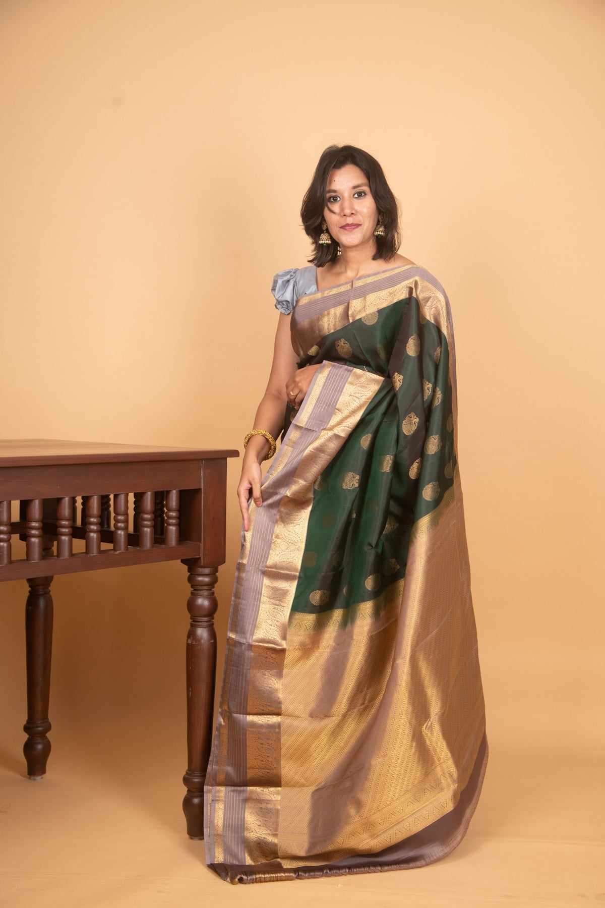 Forest green and grey pure silk saree