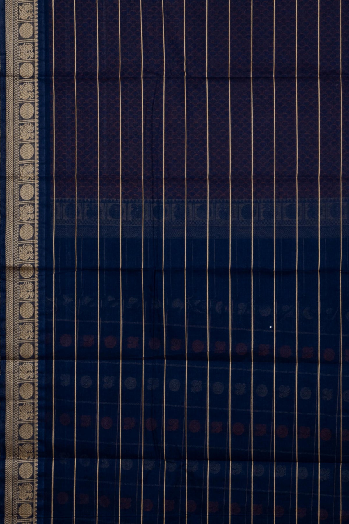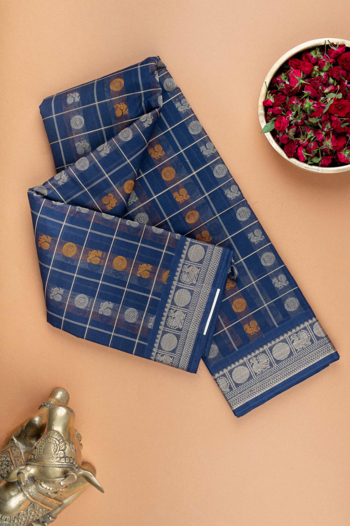 Blue body is adorned with mayil and chakram motifs in checks pattern with rich pallu in thread work and blouse.