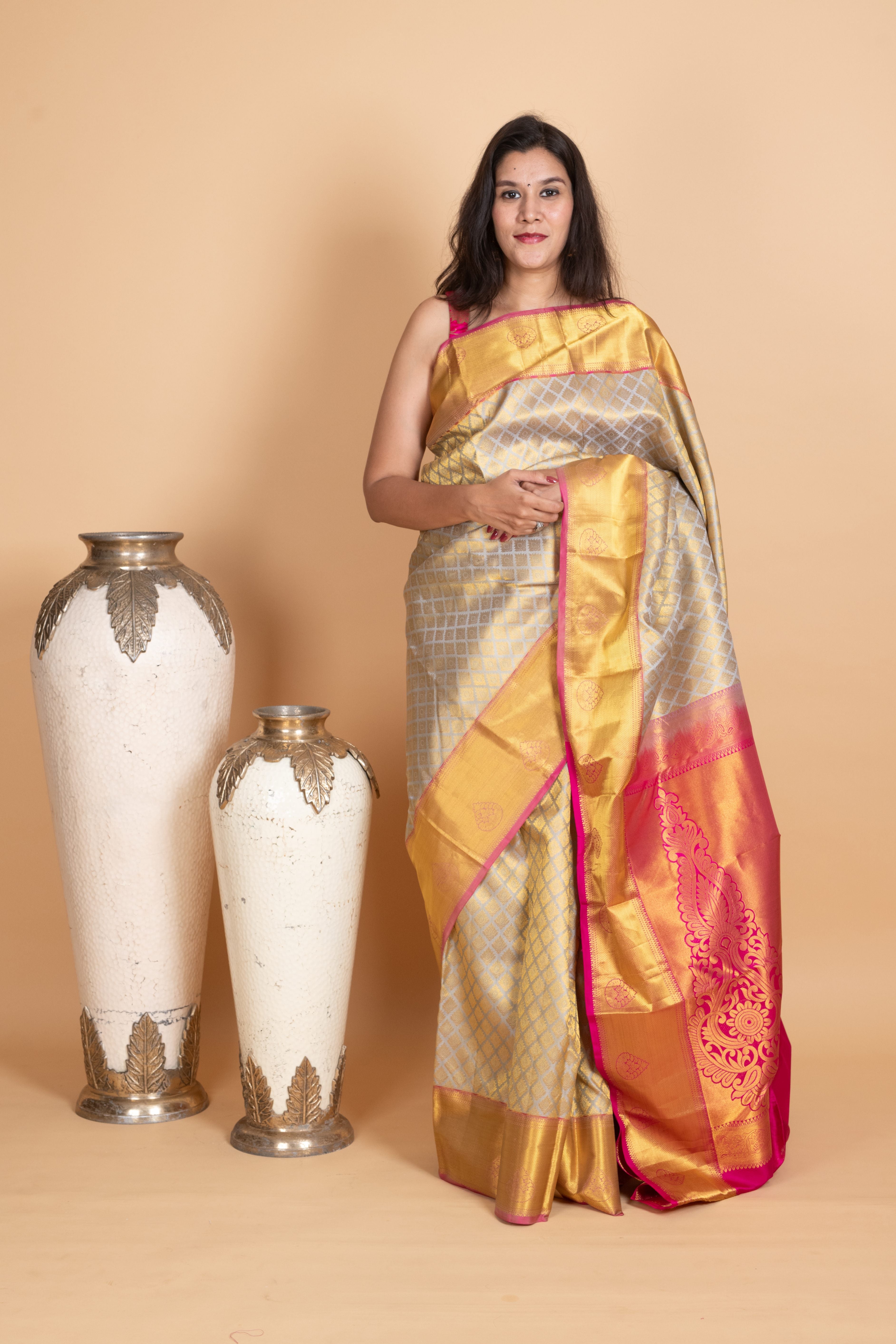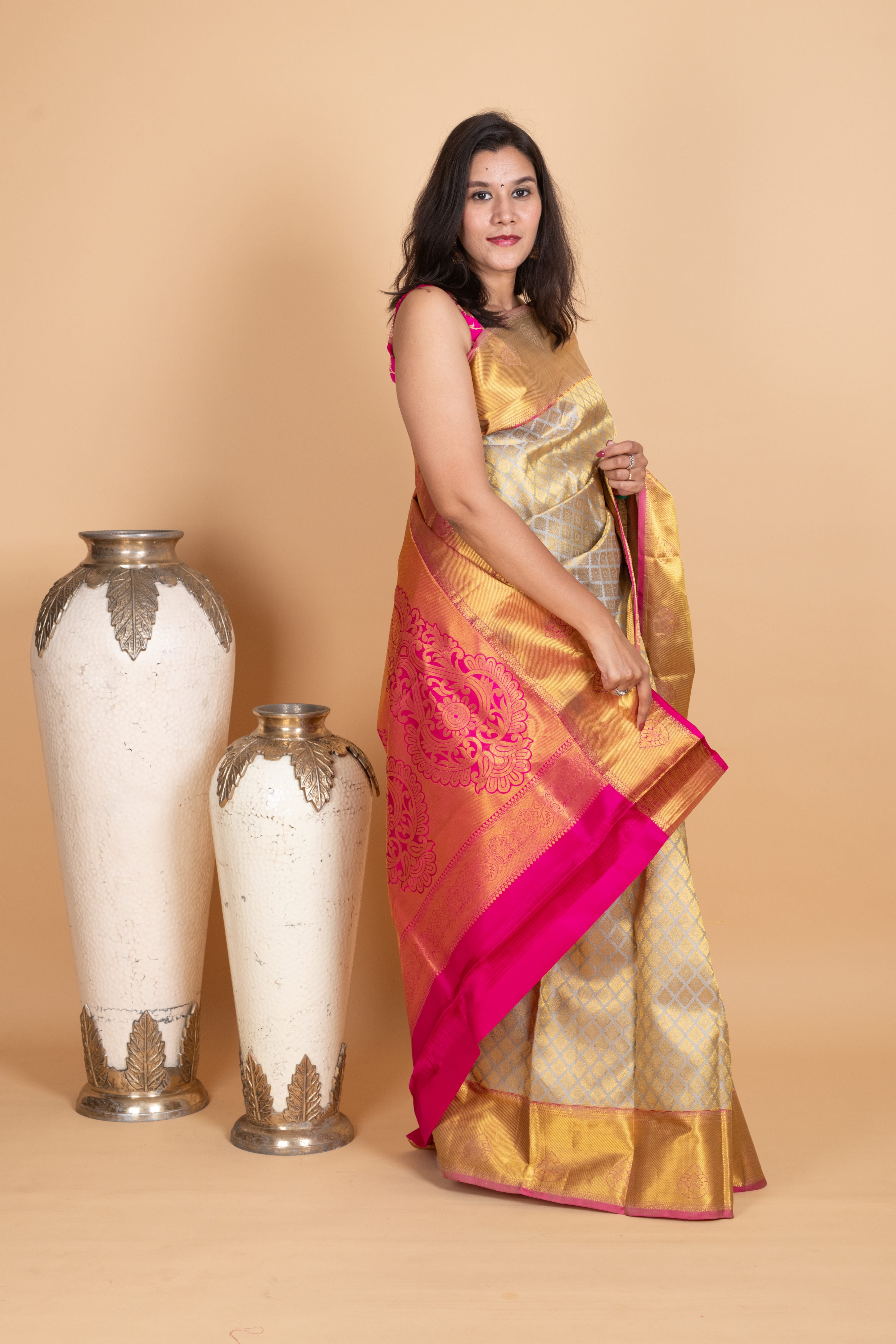 Ice Grey and Rani Pink Kanjivaram Pattu Saree