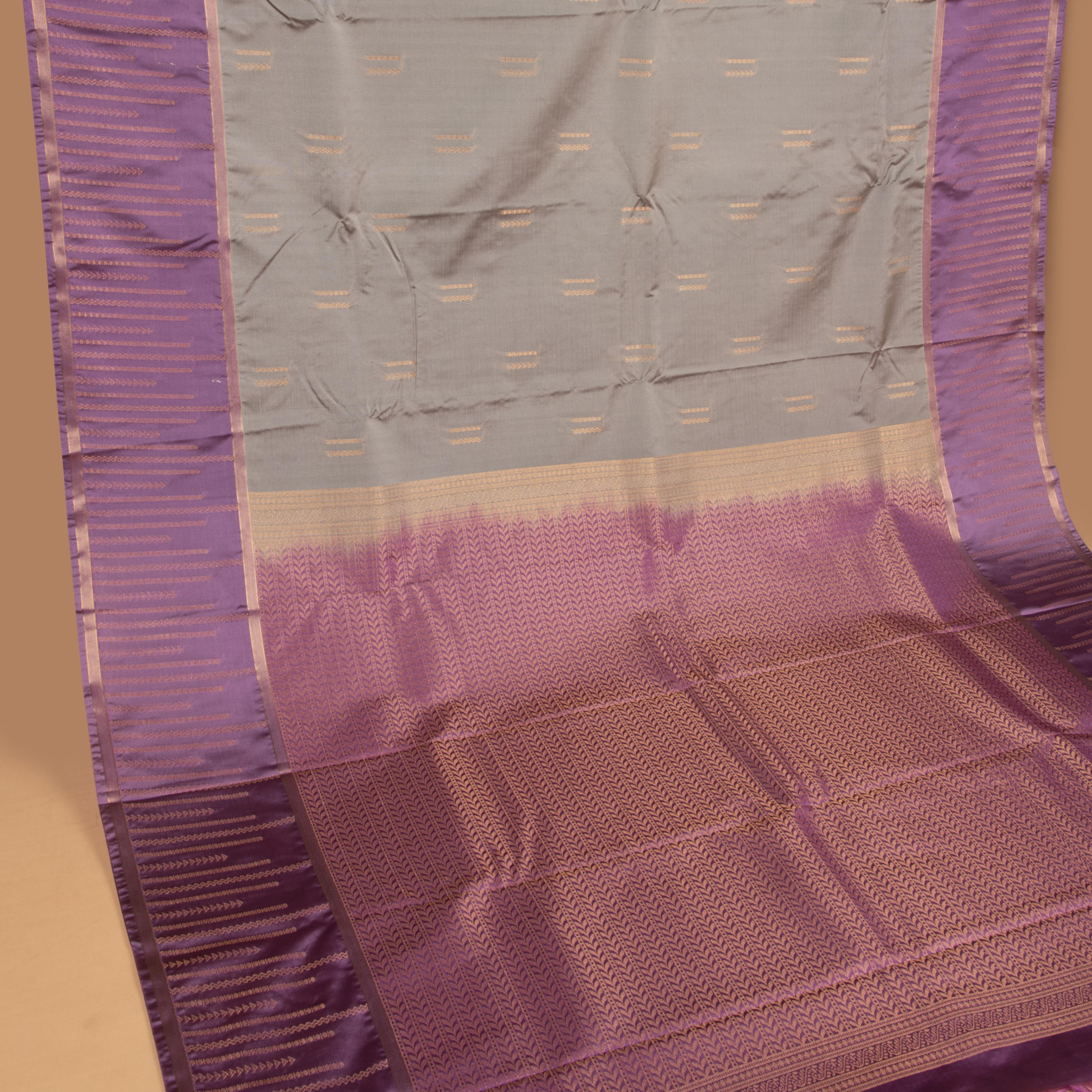 Saree Colour: Iron grey Zari: Gold Weaving Technique: Korvai Weave Blouse Colour: Sunset purple