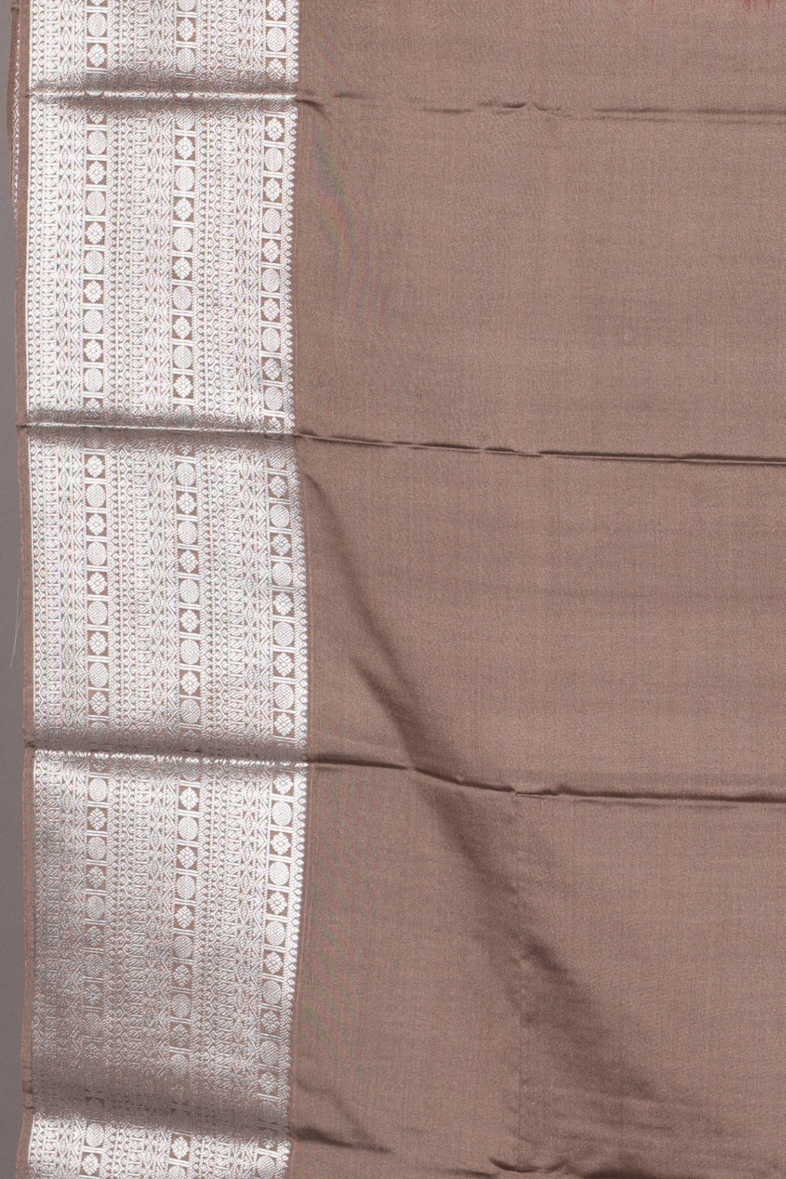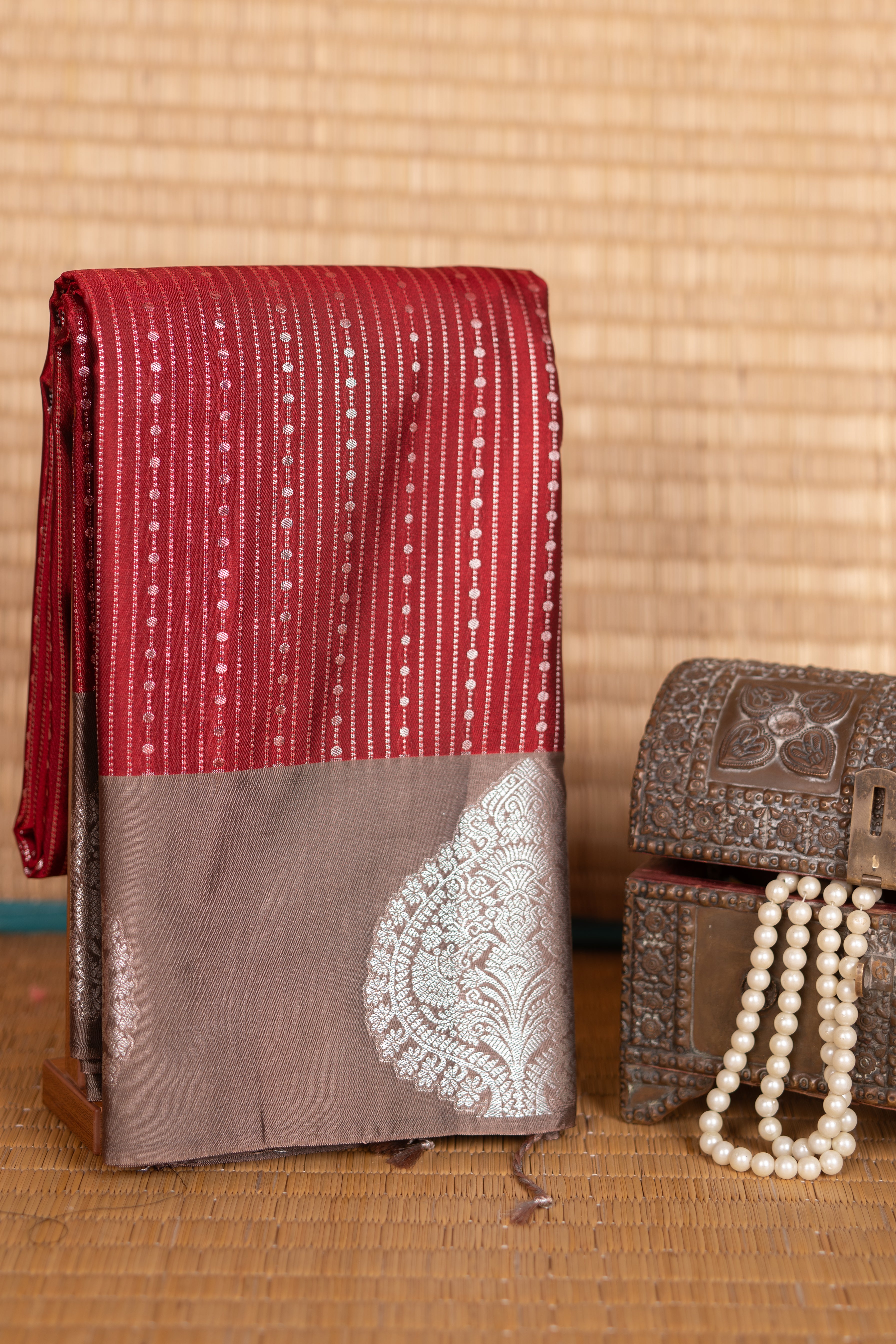 The maroon section is adorned with delicate vertical silver zari stripes, adding a refined shimmer. The beige pallu features intricate silver zari motifs in a classic paisley and floral pattern, enhancing its traditional appeal.