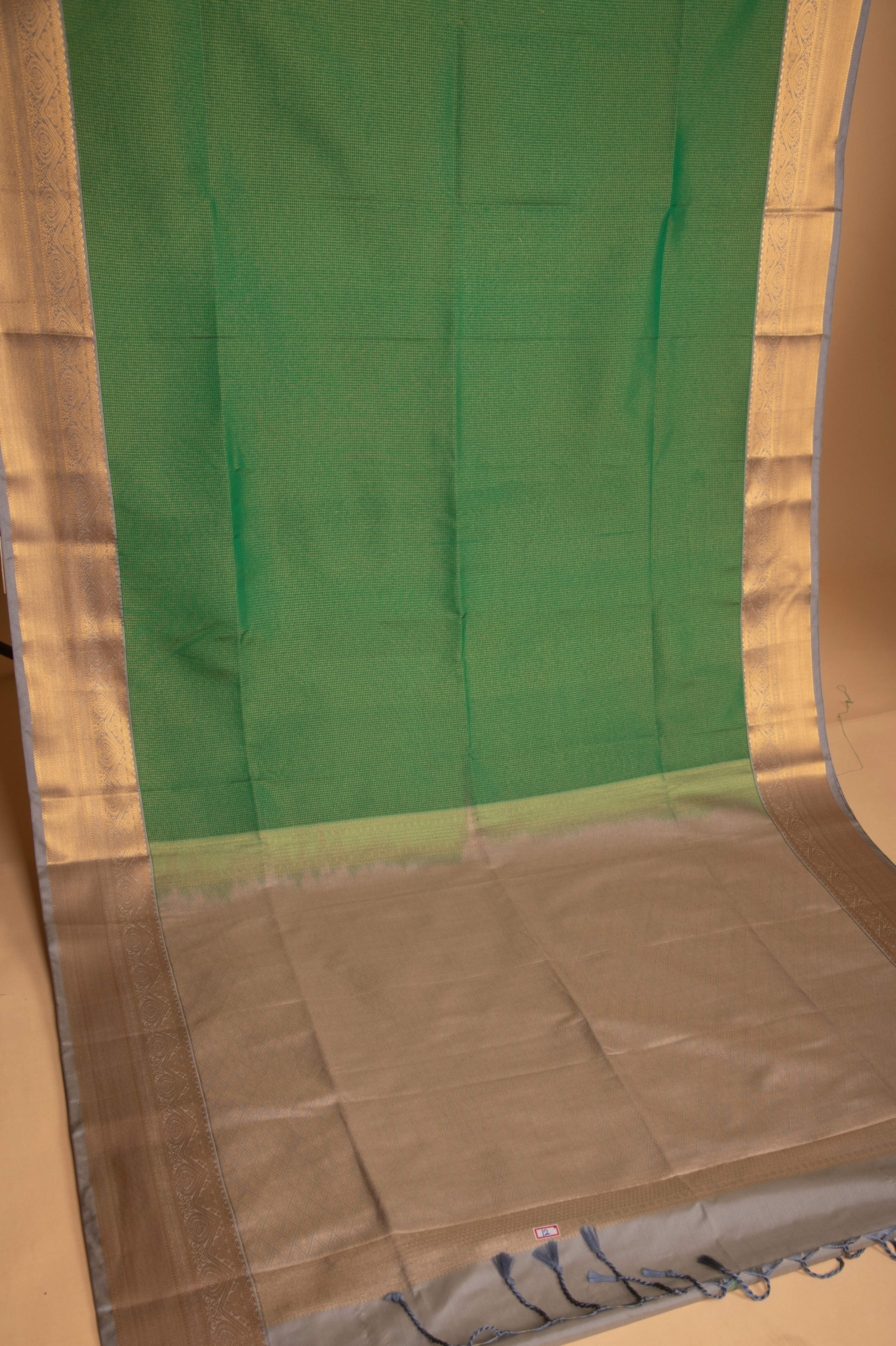 Saree Colour: Jungle Green Zari: Gold Weaving Technique: Korvai Weave Blouse Colour: Steel grey