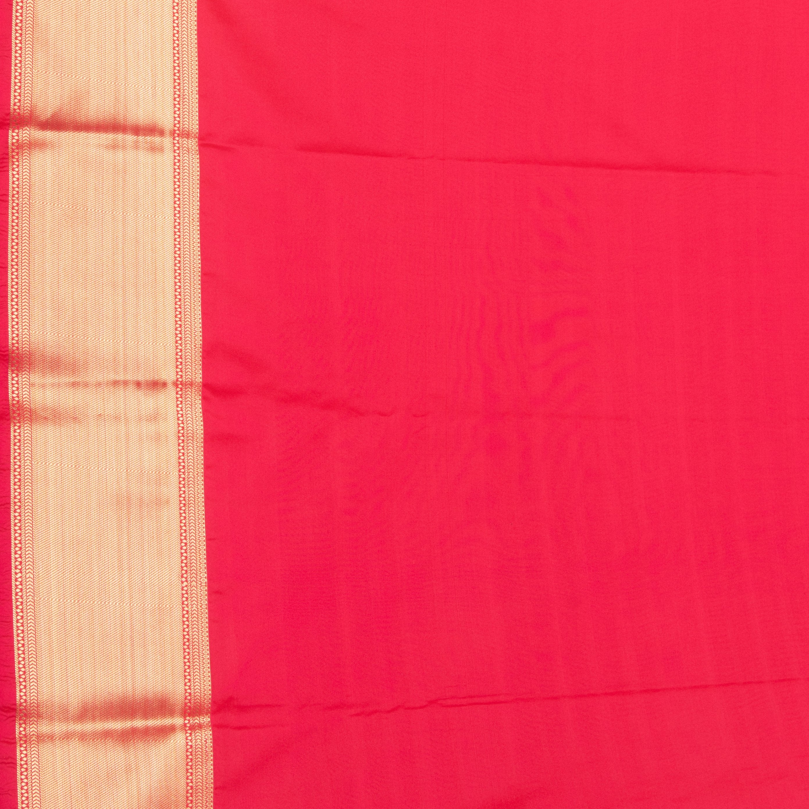 The Mango Yellow body features an overall vertical stripe pattern woven in gold zari, creating a subtle texture and added shimmer across the drape.The broad Reddish Pink section is densely woven with an intricate all-over gold zari pattern (likely geometric or mesh weave), giving the pallu a rich, structured weight and exceptional brilliance.The borders are clearly defined by wide bands of solid gold zari weave, framing the rich pink field beautifully and adding a final touch of opulence.