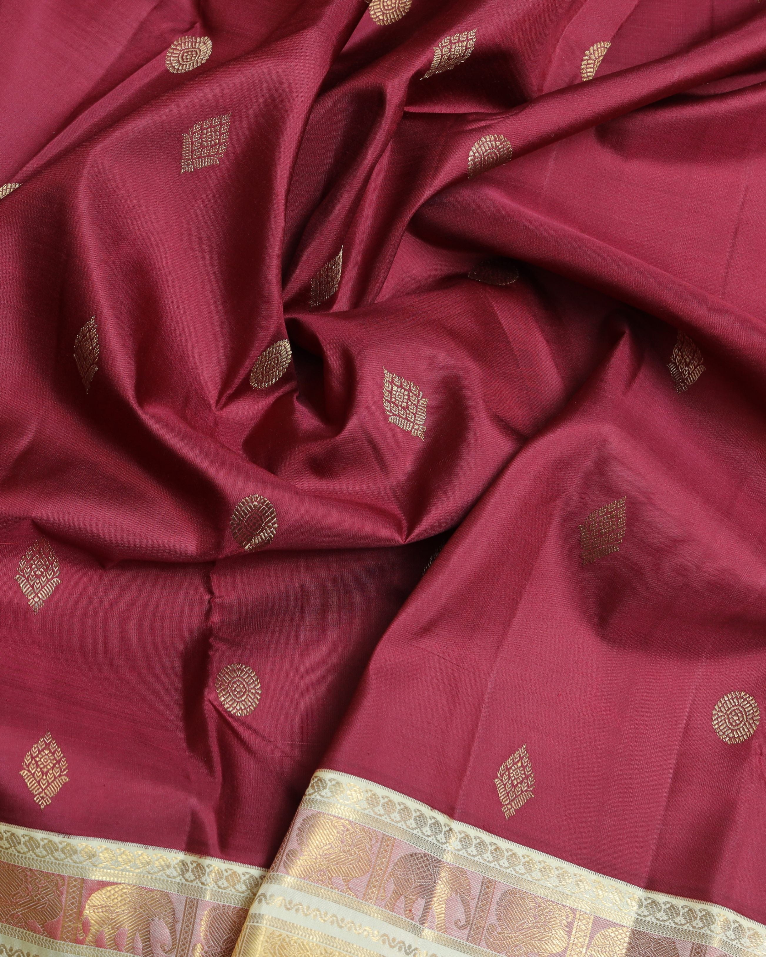 Saree Colour: Maroon Zari: Gold Weaving Technique: Korvai WeaveBlouse Colour: cream