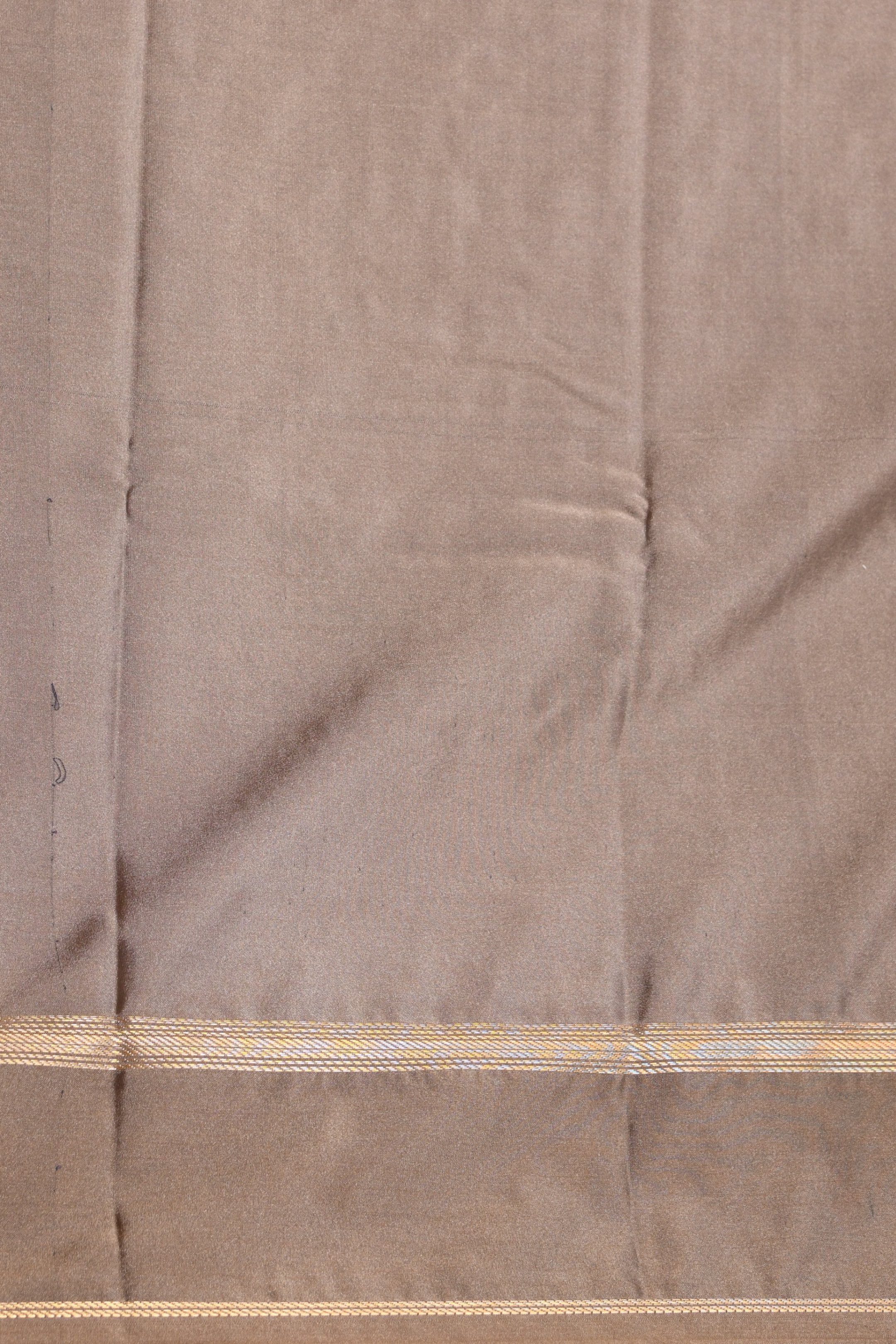 A rich, deep Maroon base that exudes maturity and elegance. The entire body is detailed with vertical gold zari pinstripes, which serve to elongate the frame and add a rhythmic, shimmering texture to the silk. The Border: A sleek, contemporary Graphite Grey border featuring a delicate gold zari chevron trim. This understated border style provides a modern frame for the vibrant maroon body. The Pallu: A magnificent Champagne-Grey pallu that transitions seamlessly from the body with a decorative "ikat-style" blurred weave. It features broad horizontal zari bands that provide a balanced contrast to the vertical stripes of the body. Last...
