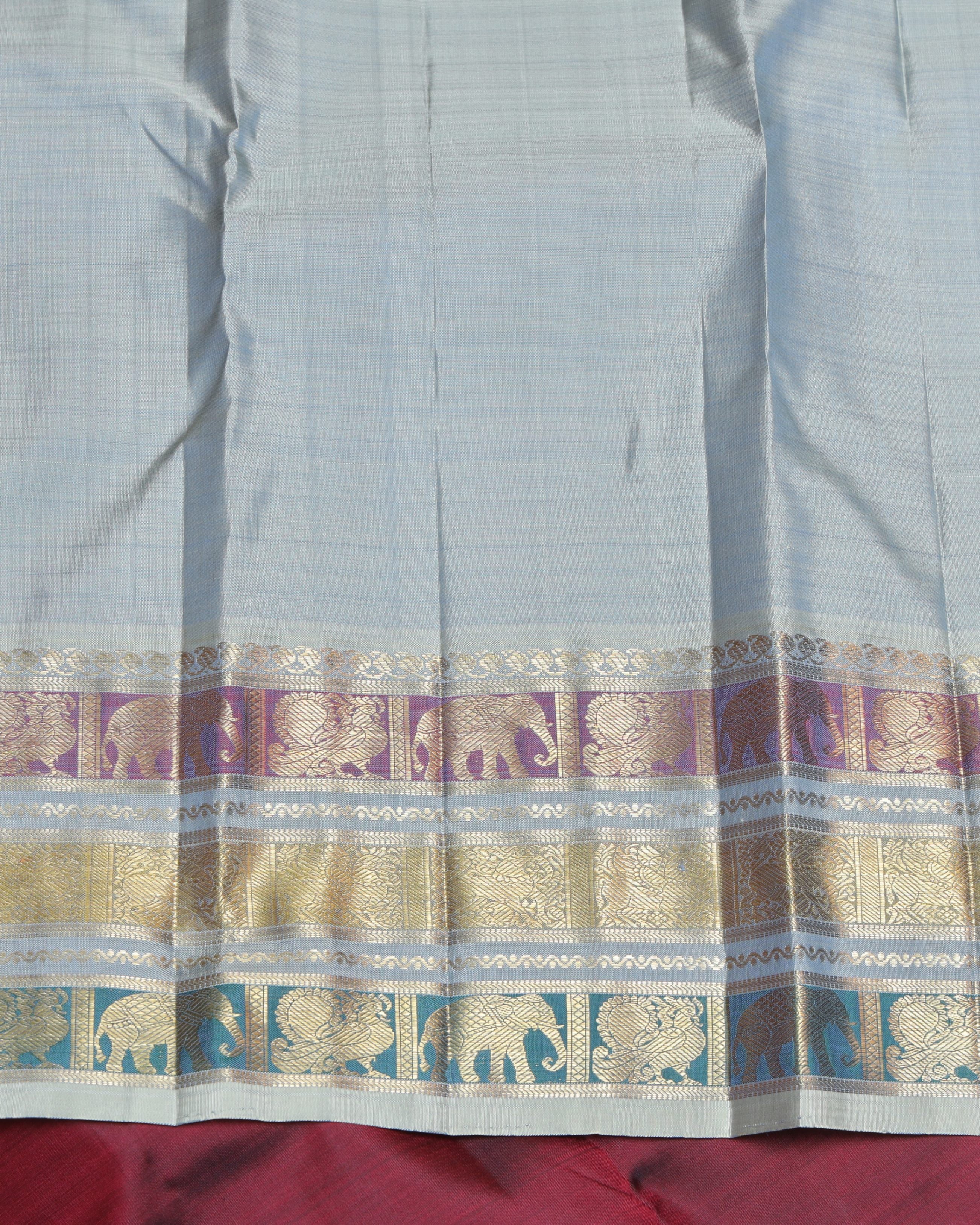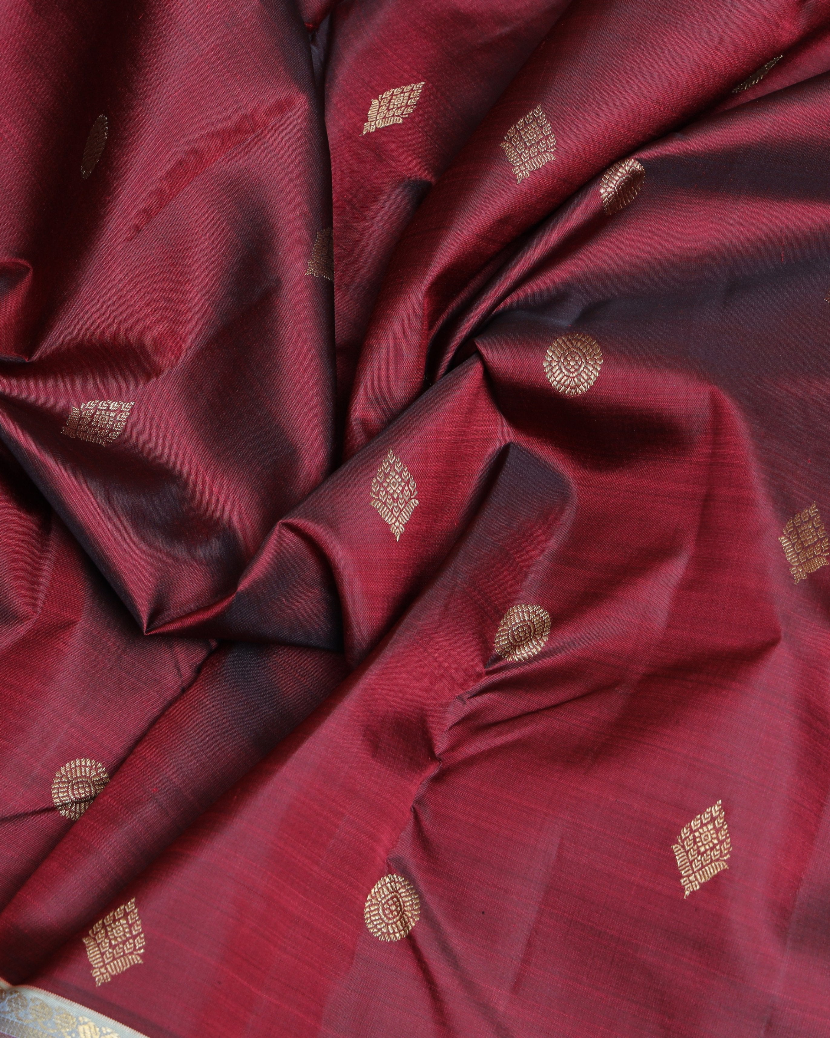 Saree Colour: Maroon Zari: Gold Weaving Technique: Traditional Weave Blouse Colour: Ice grey