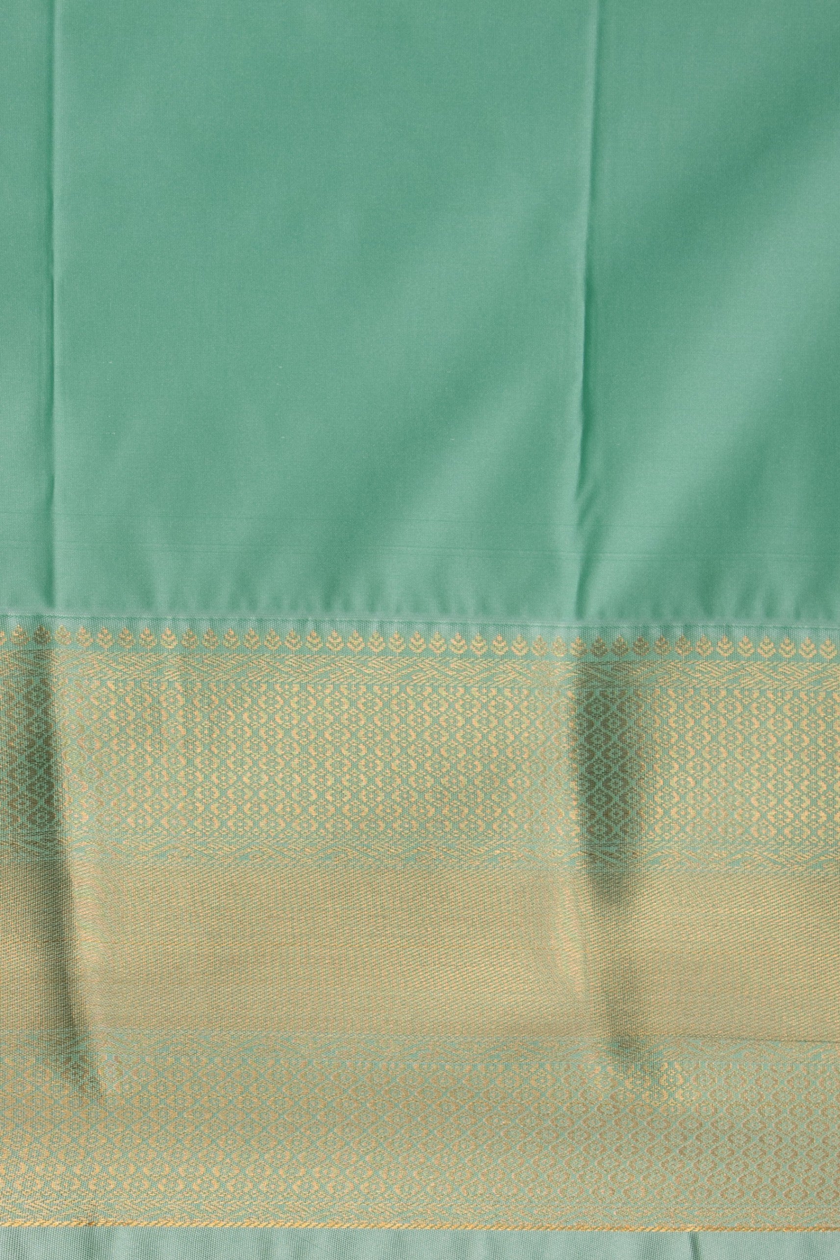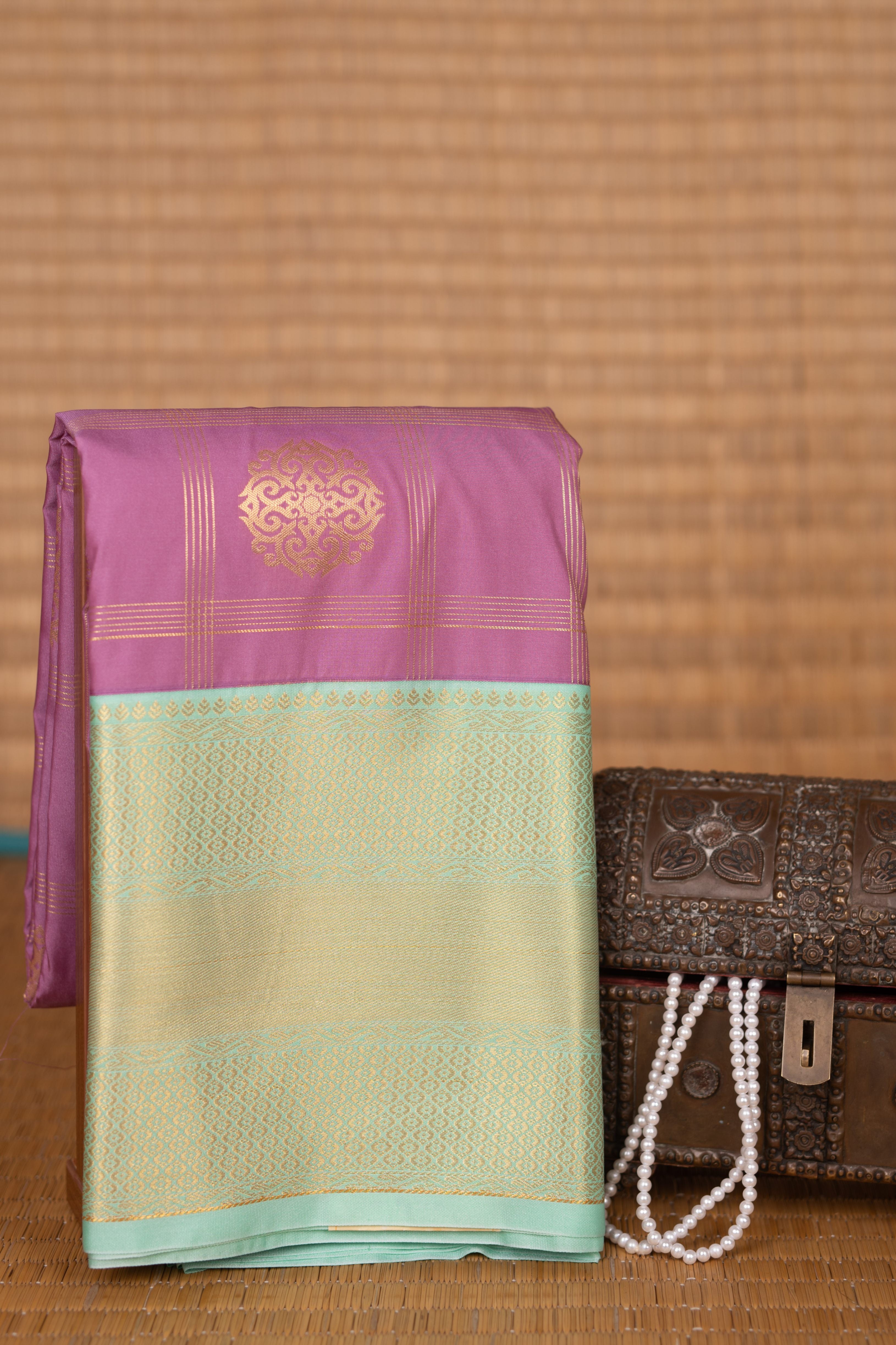 A delicate Mauve Pink woven with subtle vertical Gold Zari stripes (kodi milai) that create a lovely texture and soft sheen. The top panel features woven square patterns (kattam). A beautifully ornate, traditional Gold Zari circular motif is prominently woven onto the top panel of the Mauve Pink body. A striking, broad border in a soft Pastel Green . This gentle hue provides a refreshing contrast to the warm pink body. The Pastel Green border is richly detailed with beautiful Gold Zari weaving. The main panel features intricate geometric and diamond patterns woven into the silk.The lower edge is framed...