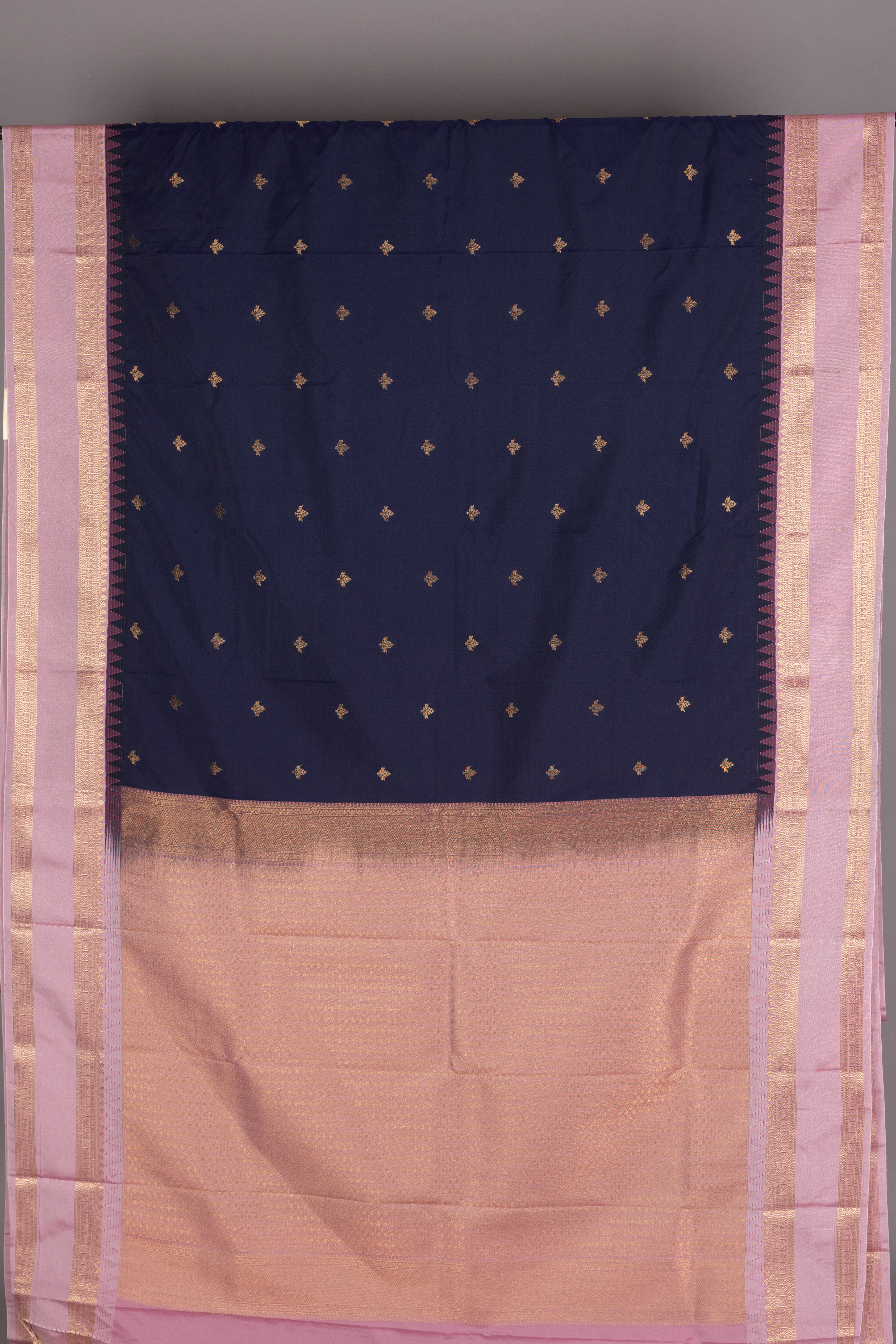 Saree Colour: Navy Blue Zari: Gold Weaving Technique: Korvai Weave Blouse Colour: Baby Pink