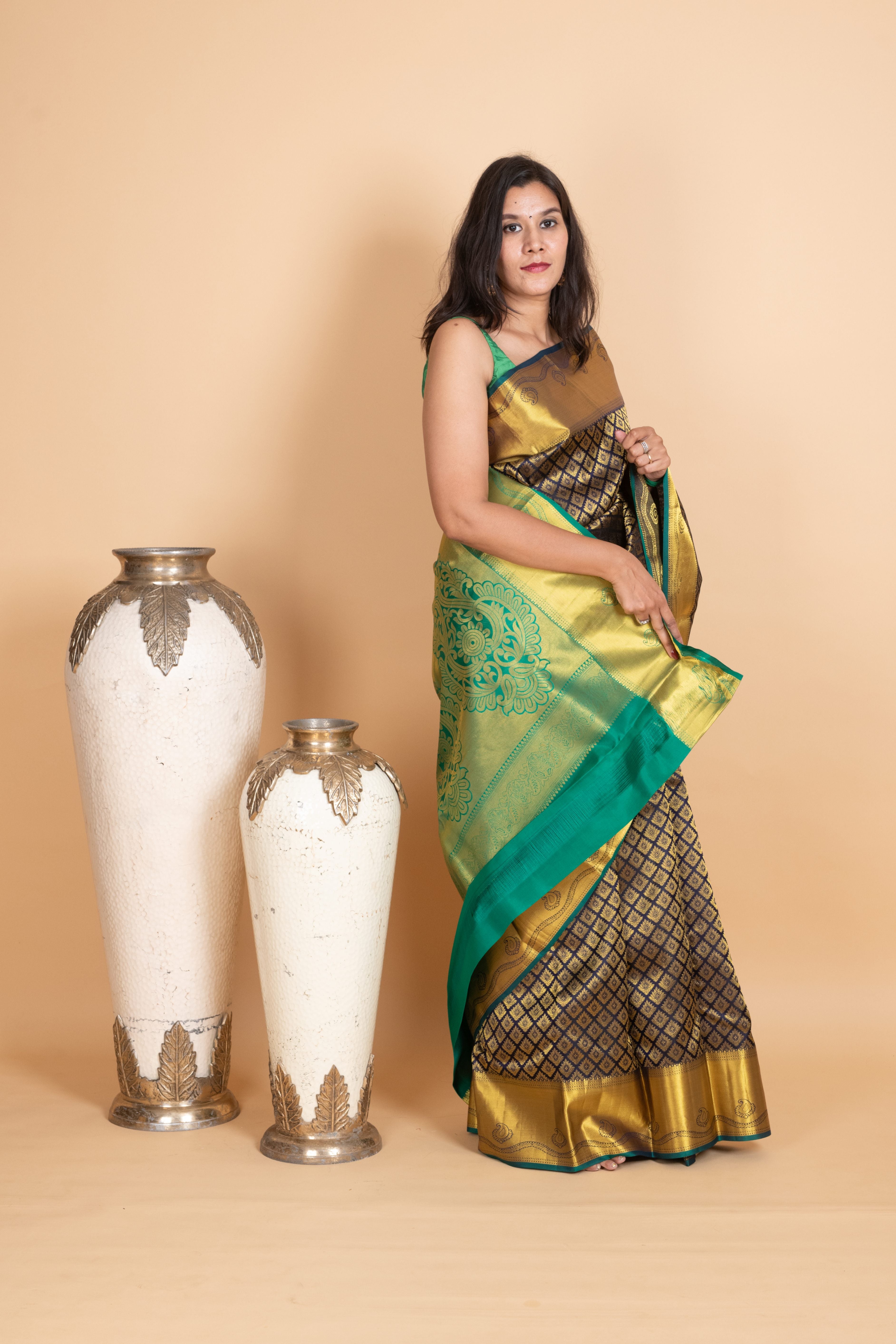 Navy Blue and Emerald Green Pure Kanjivaram Silk Saree