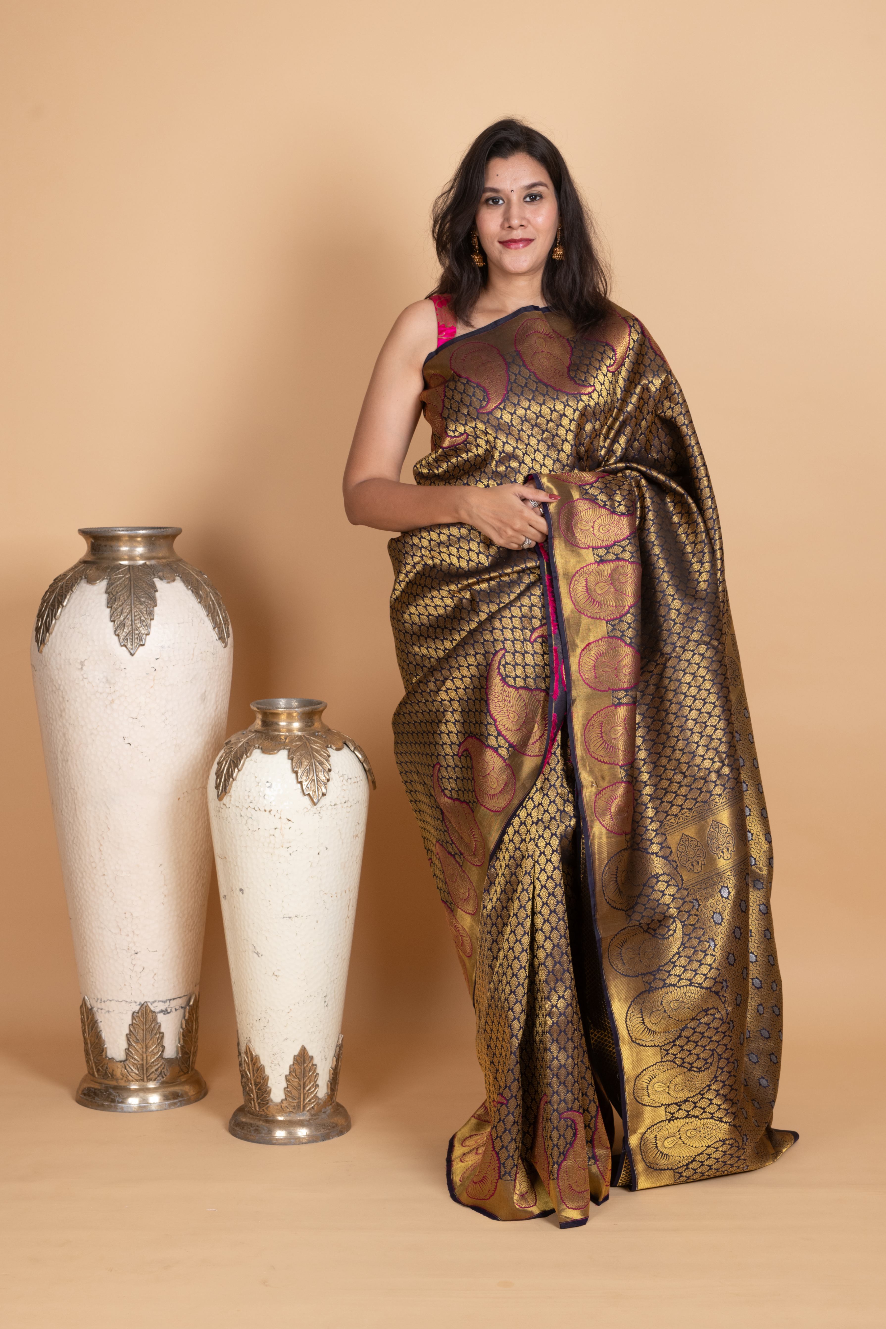 Saree Colour: Navy blue Zari: Gold Weaving Technique: Brocade WeaveBlouse Colour: Navy Blue
