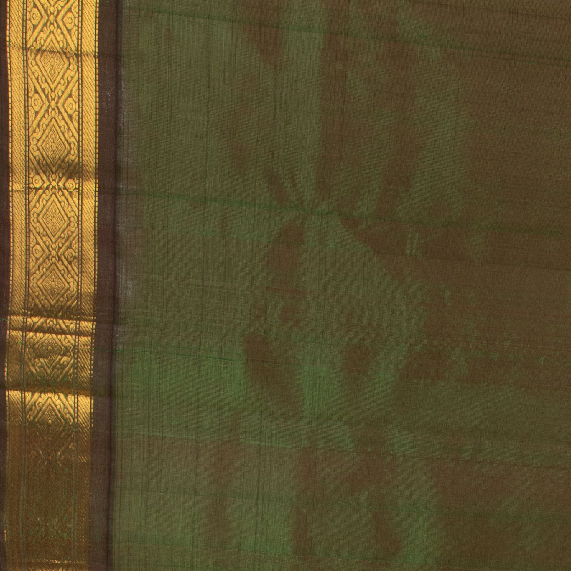 The Orange field features a distinct self-woven texture (like fine horizontal ribbing or warp-weft variations) that gives the fabric a rustic, yet sophisticated look.The border is defined by multiple bands of green and gold zari. The main band features intricate gold-toned zari weaving with geometric and temple-like patterns, bordered by solid, deep green fabric for a structured, traditional frame.The expansive pallu showcases a rich blend of the two greens and gold, woven with dense geometric or chevron zari patterns.