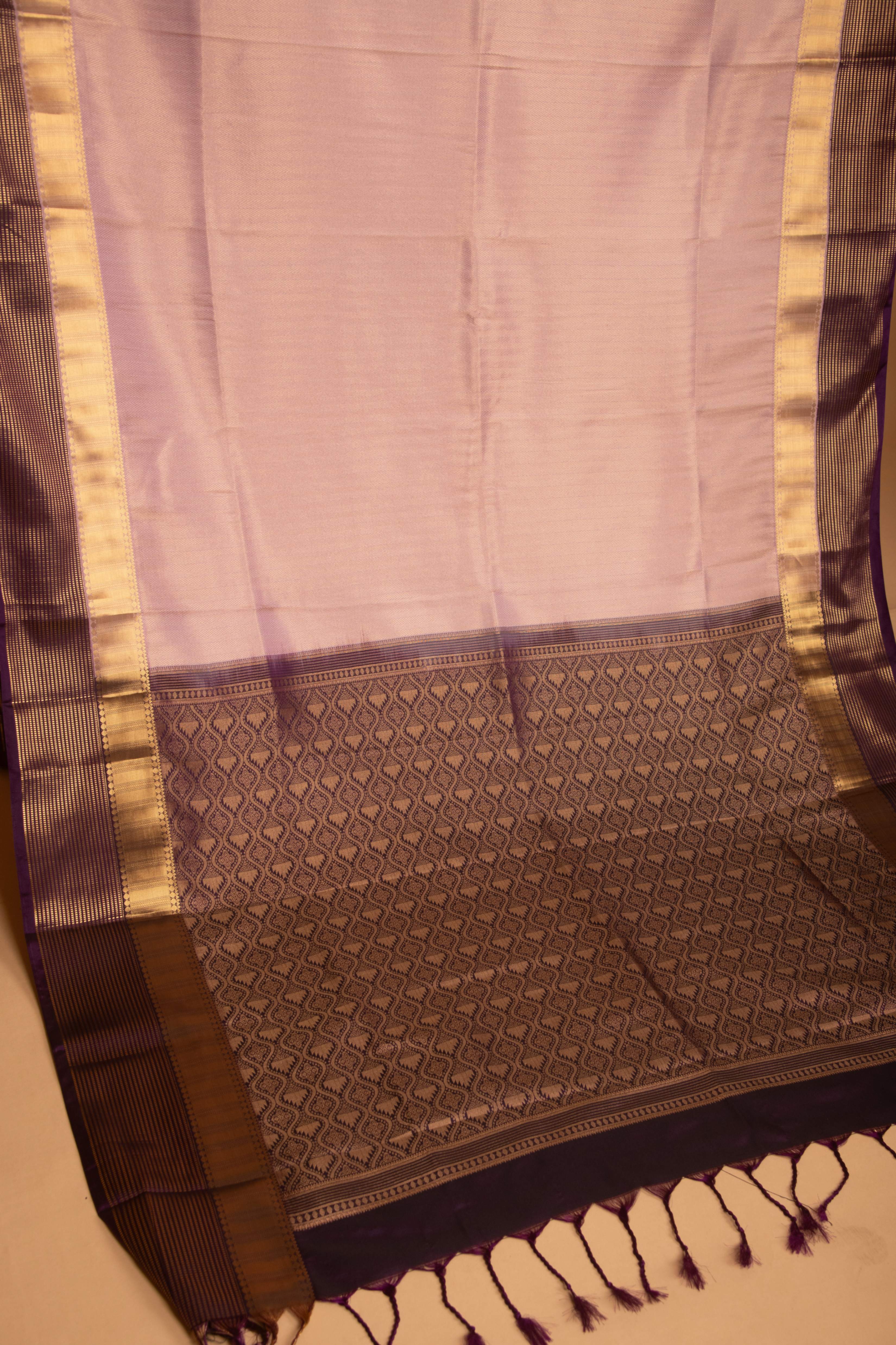 Embrace the delicate elegance of this Soft Silk Saree, featuring a luminous, dual-tone body that shimmers between Onion Pink and a soft Lavender hue. The fine weave gives the fabric a beautiful, sheer quality that drapes exquisitely. The border features prominent bands of shimmering Gold Zari, providing a classic, festive structure against the deep purple. The lower edge of the saree and the pallu feature a broad band of intricate weaving in the deep purple color. The design is a sophisticated, dense diamond or lattice pattern, woven with a dark thread that adds a rich, heavy texture to the pallu. The saree is finished with soft tassels in the matching purple shade. Last image shown is the blouse.
