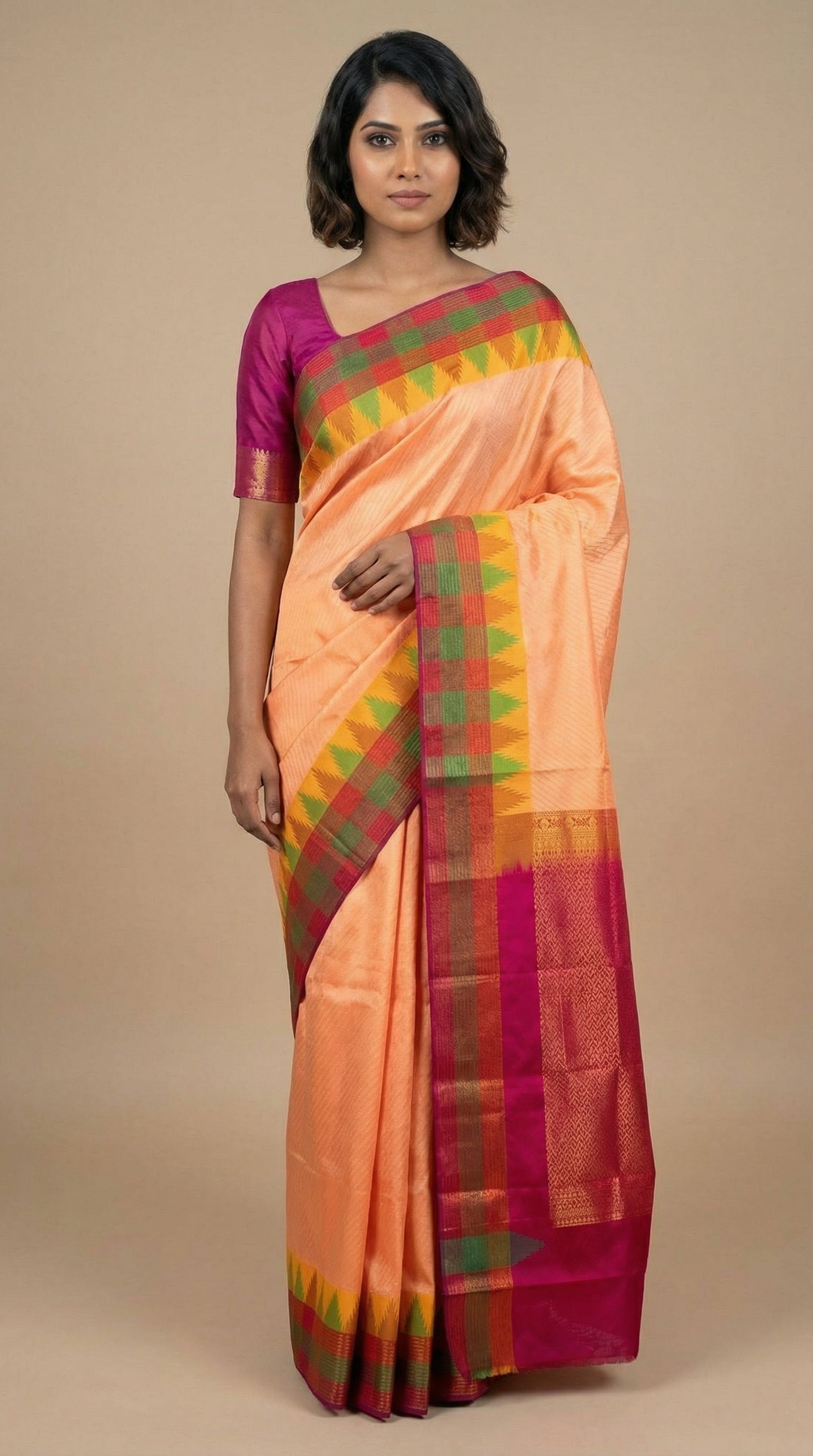 Saree Colour: Peach Zari: Gold Weaving Technique: Korvai weave Blouse Colour: Pink