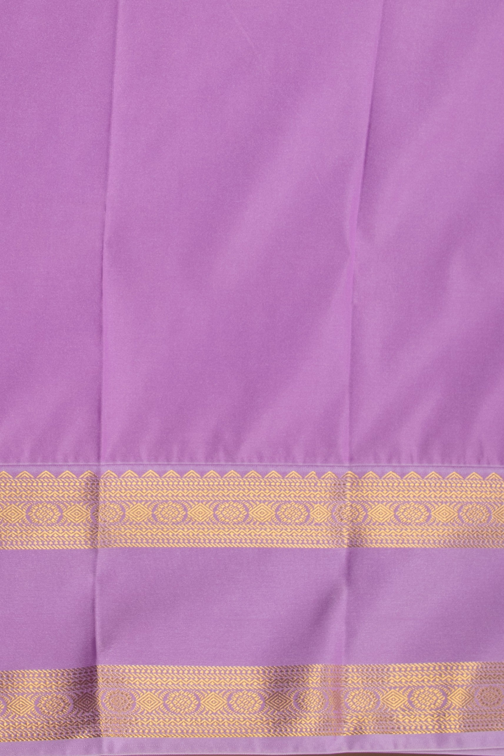 The deep Peacock Blue body is intricately woven with the classic Vairaoosi (diamond needle) pattern. This distinctive weaving features fine, close-set vertical stripes that run continuously, interspersed with delicate Gold Zari buttas (motifs) in the shape of small paisley or leaves. This dense texture gives the fabric a rich, structured feel and a unique vertical gleam. The border features prominent, traditional bands of Gold Zari weaving, providing a crisp and luxurious frame for the subtle Lavender tone. The pallu is the center piece, rendered in a luminous Lavender that transitions into a slight golden or rose gold hue due to...