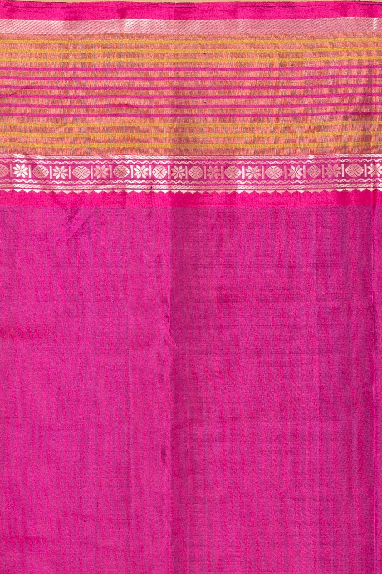 Make a bold, contemporary statement with this luxurious Peacock Blue and Wildberry Pink Pure Silk Kanjivaram Saree. The body boasts a deep, shimmering Peacock Blue dual-tone that changes beautifully with the light, while the borders and pallu explode in a magnificent contrast of bright Wildberry Pink, Fuchsia, and Yellow accents. Woven as a "Zero Zari" piece, the focus is entirely on the superb texture, high sheen, and the breathtaking blend of colors. he magnificent pallu is a masterpiece of color blocking and striping, featuring broad horizontal bands of Wildberry Pink, Fuchsia, and Gold-Yellow, finished with matching tassels.